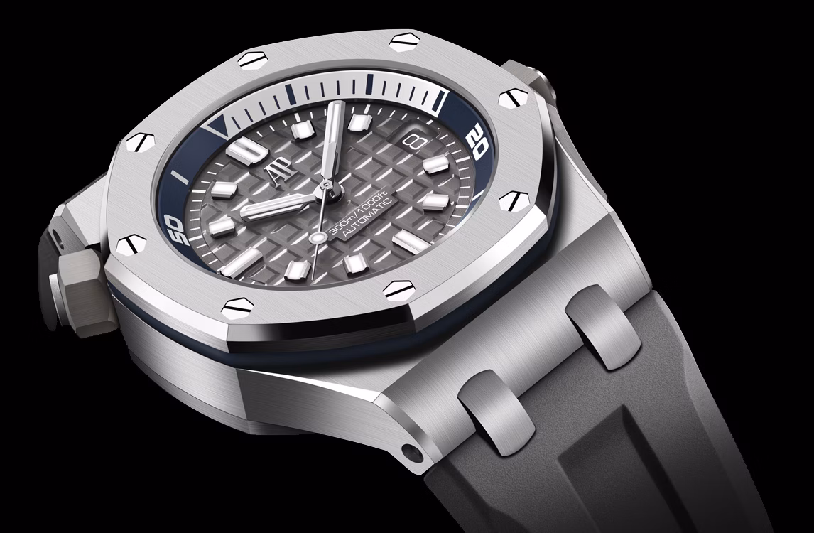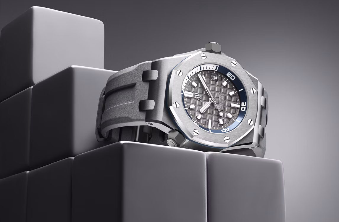 「メガタペストリー」模様のグレーダイヤル、蓄光処理を施したホワイトゴールドのアプライドアワーマーカーとロイヤルオーク針、60分から15分までのゾーンがホワイトカラーの回転式ブルーインナーベゼル