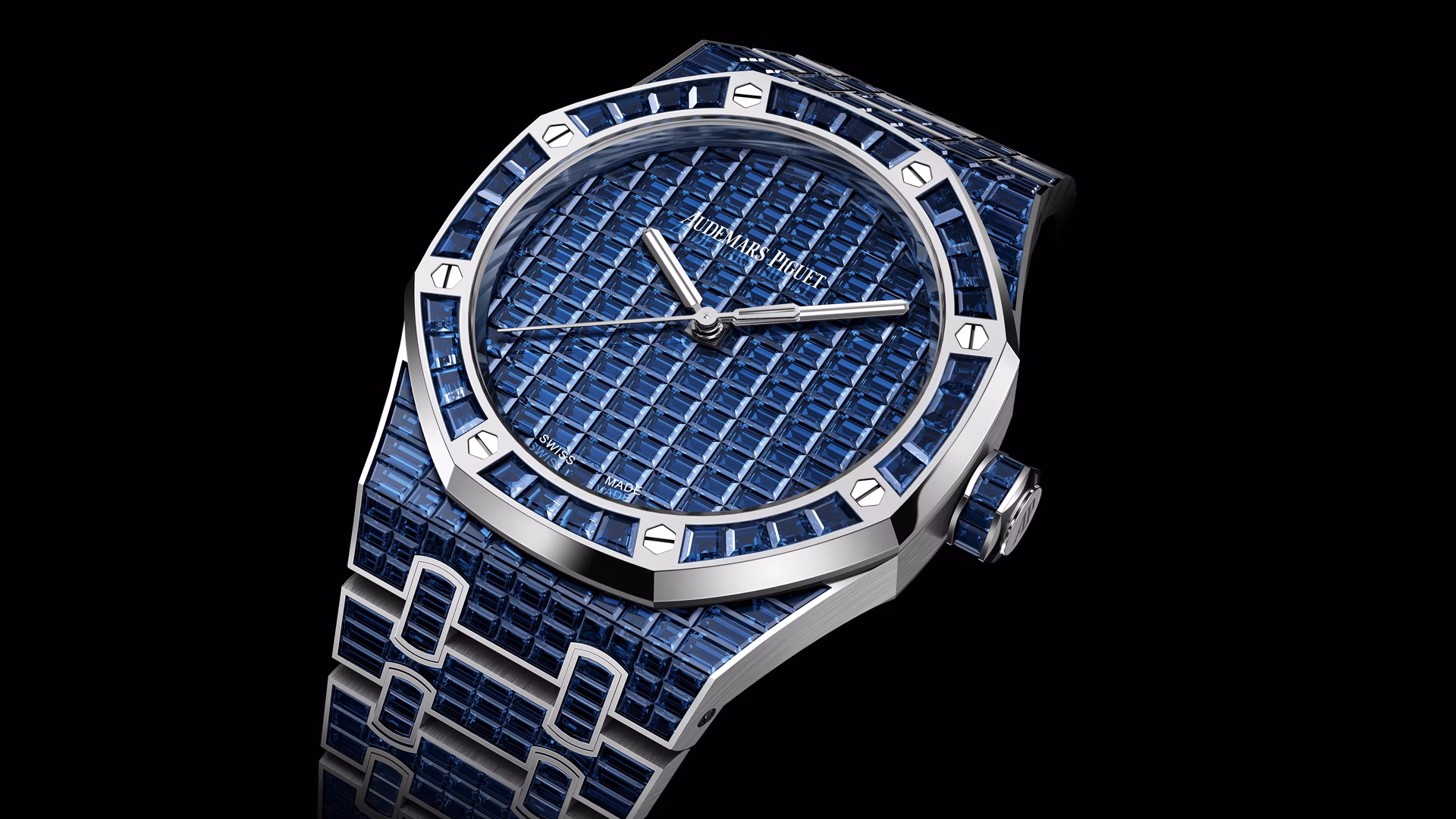 このピースはそれぞれが違うカラーのジェムストーンで彩られた10本セットの一部です。861個のブルーサファイア(約41.4カラット)がこの41ミリのロイヤル オーク オートマティックを飾り、存在感を示しています。このウォッチはコレクションの新しいケースとブレスレットの進化したデザインを取り入れ、特製のアニバーサリー記念ローターを備えています。