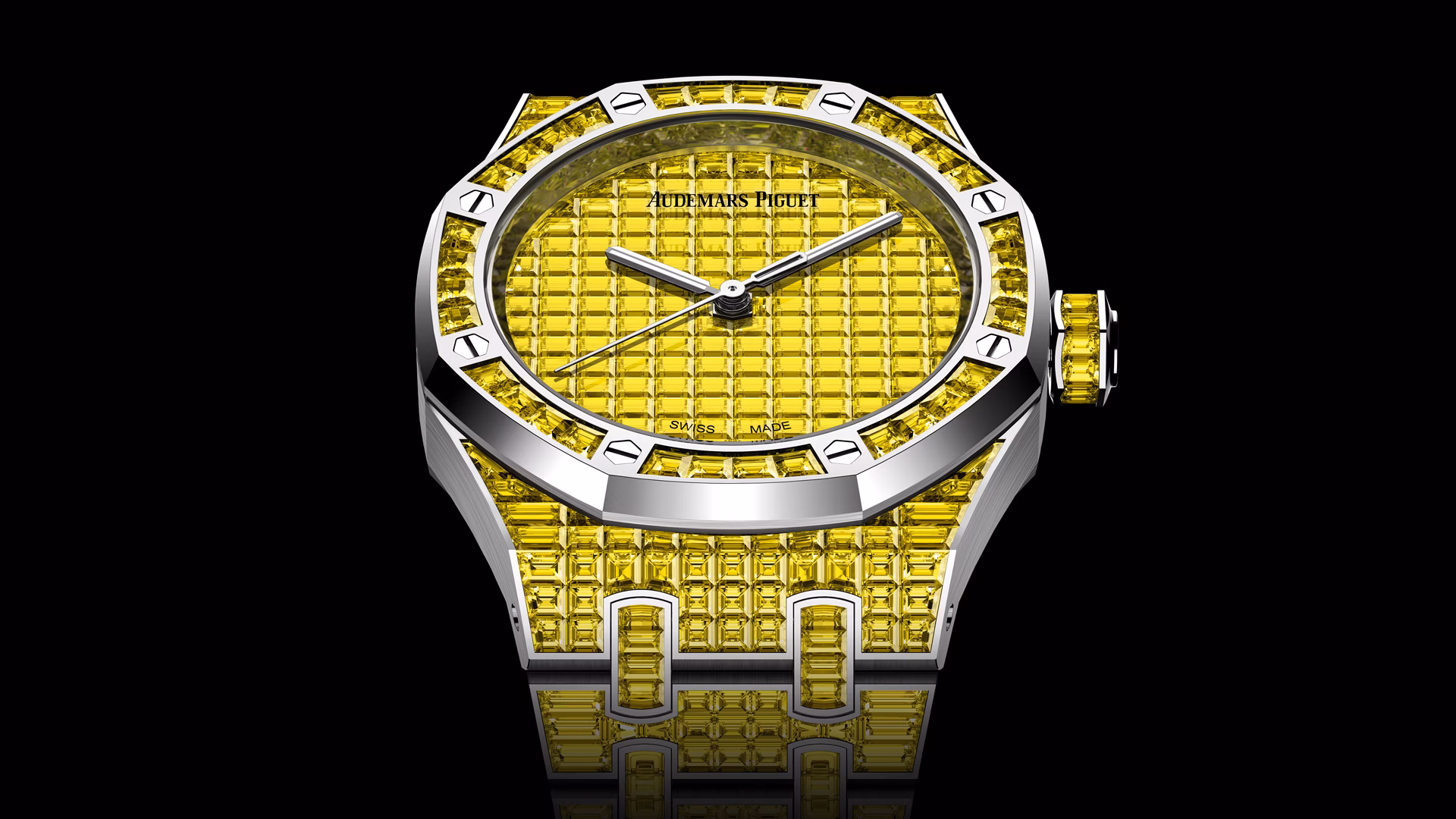 このピースはそれぞれが違うカラーのジェムストーンで彩られた10本セットの一部です。37ミリのロイヤル オーク オートマティックはコレクションの新しいケースとデザインの進化を取り入れ、790個のイエロークリソベリル(約29.3カラット)をセットしています。このウォッチはまた50周年記念ローターを備えています。