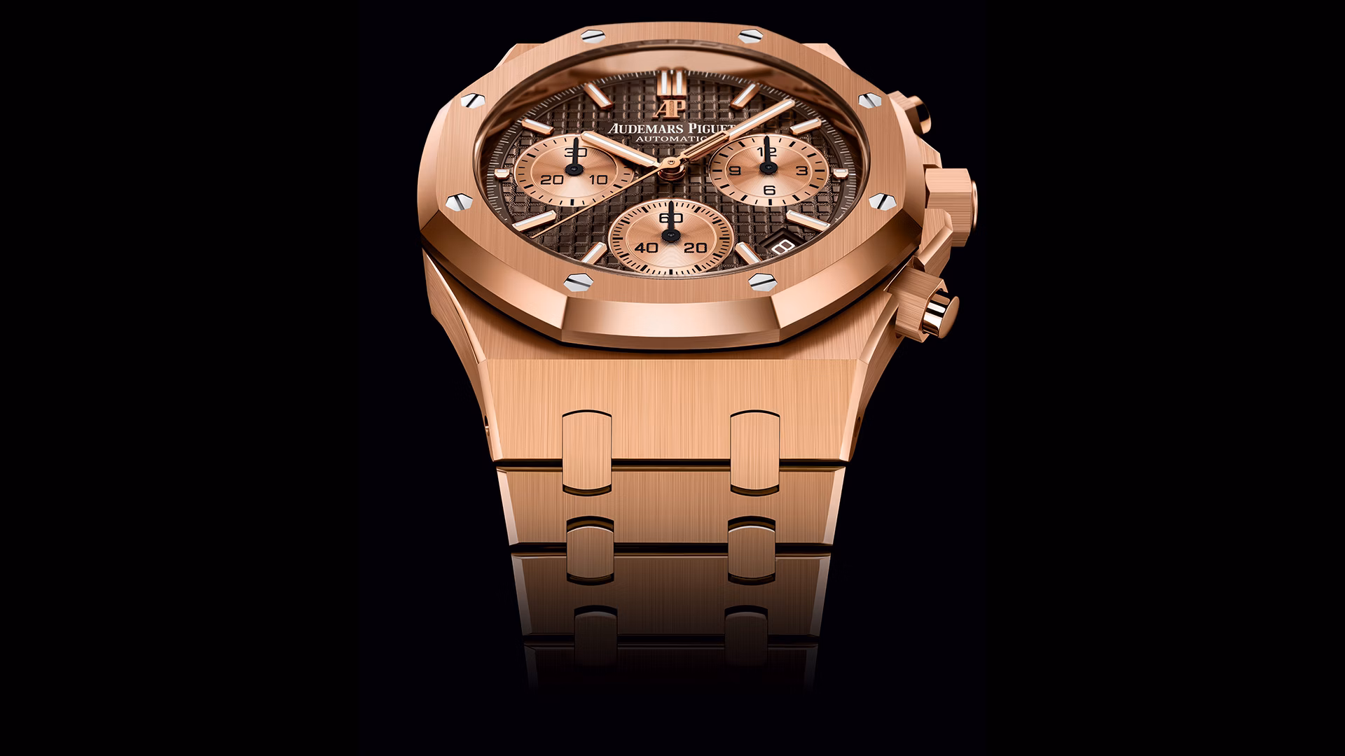 「グランドタペストリー」模様のブラウンダイヤル、ピンクゴールドカラーのカウンター、蓄光処理を施したピンクゴールドのアプライドアワーマーカーとロイヤルオーク針