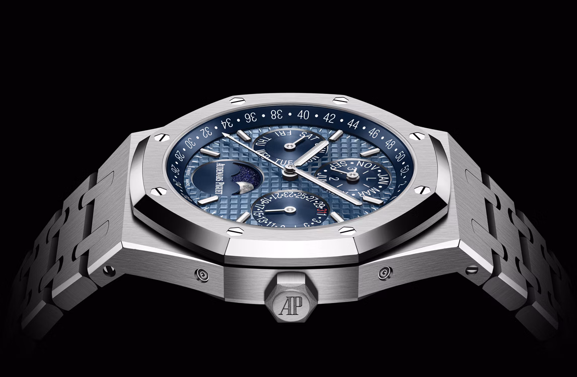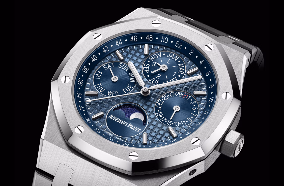 ステンレススティールのロイヤル オーク パーペチュアルカレンダー。ブルーの濃淡が美しいダイヤルを組み合わせています。サブダイヤルとインナーベゼルは、オリジナルのロイヤル オークを踏襲したカラー「ナイトブルー、クラウド50」。