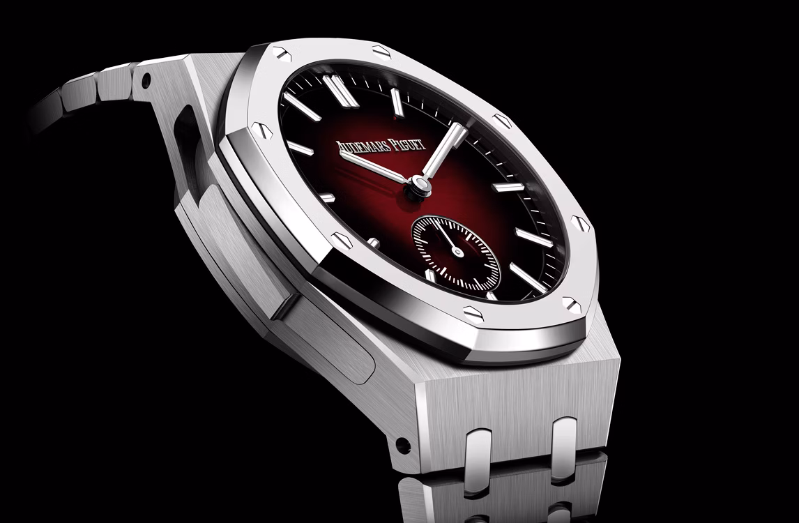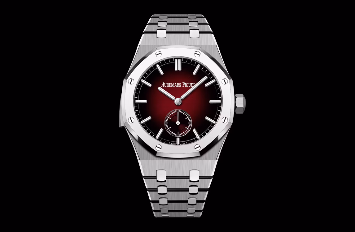 特別なスモーク バーガンディー ダイヤル、蓄光処理を施したホワイトゴールドのアワーマーカーとロイヤルオーク針。