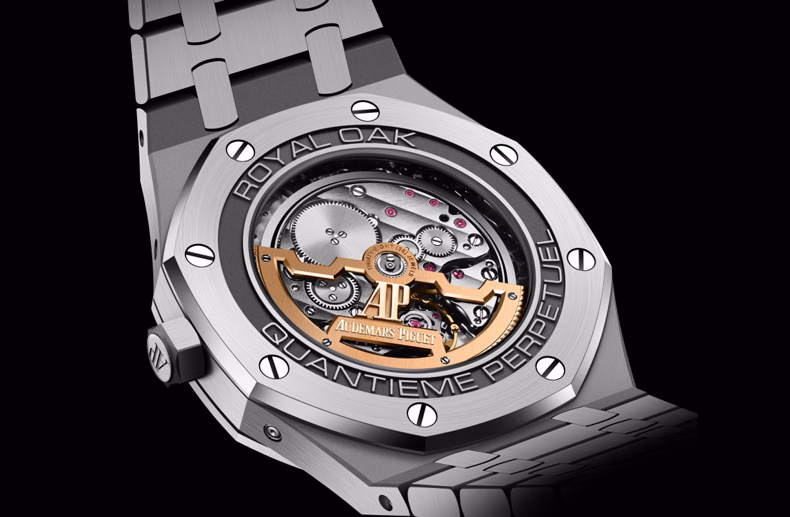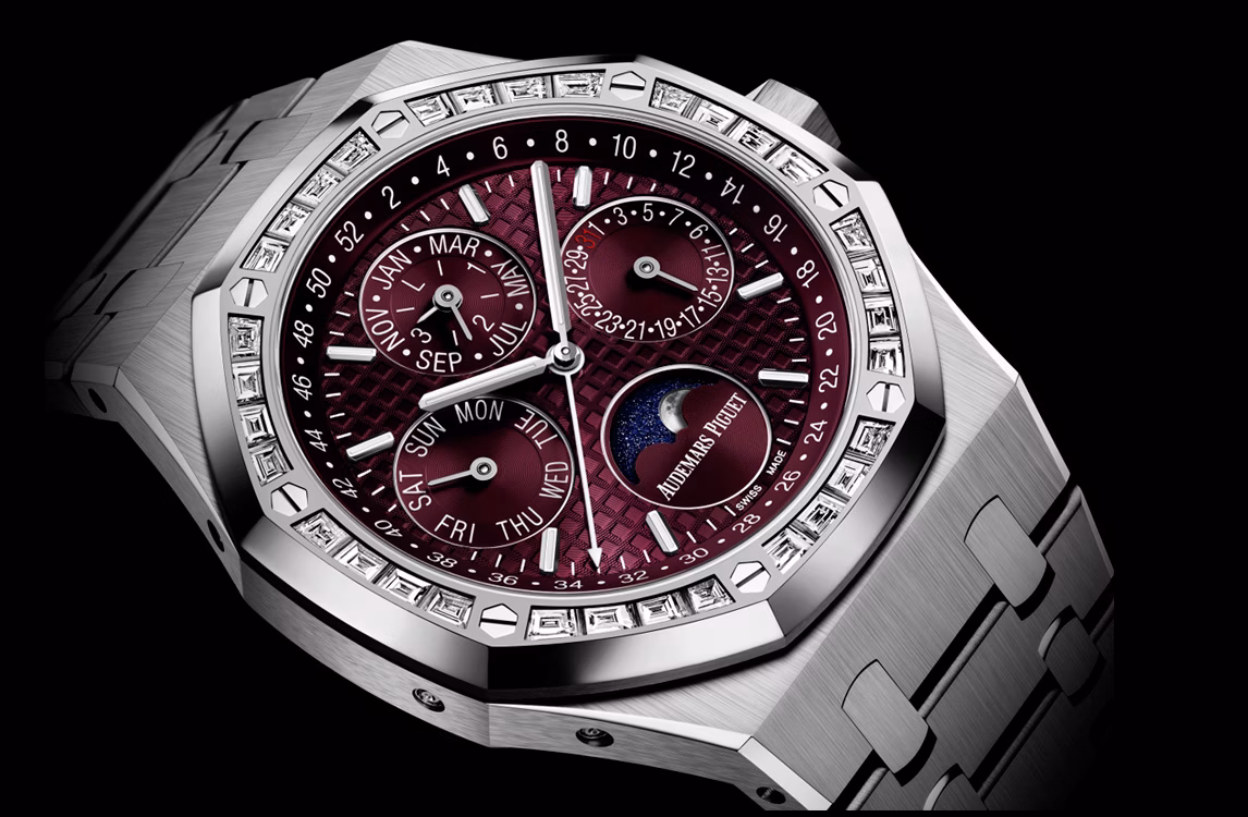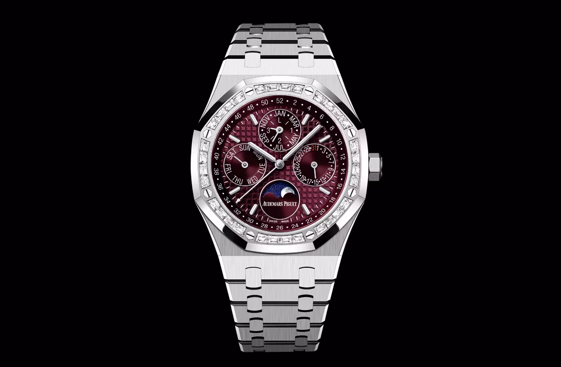 18Kホワイトゴールドのロイヤル オーク パーペチュアルカレンダーは、鮮やかなパープルのグランドタペストリーダイヤル、バゲットカットダイヤモンドセットのベゼルを組み合わせています。