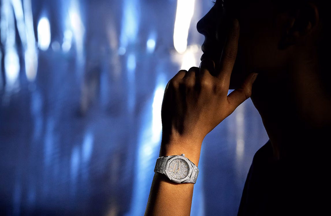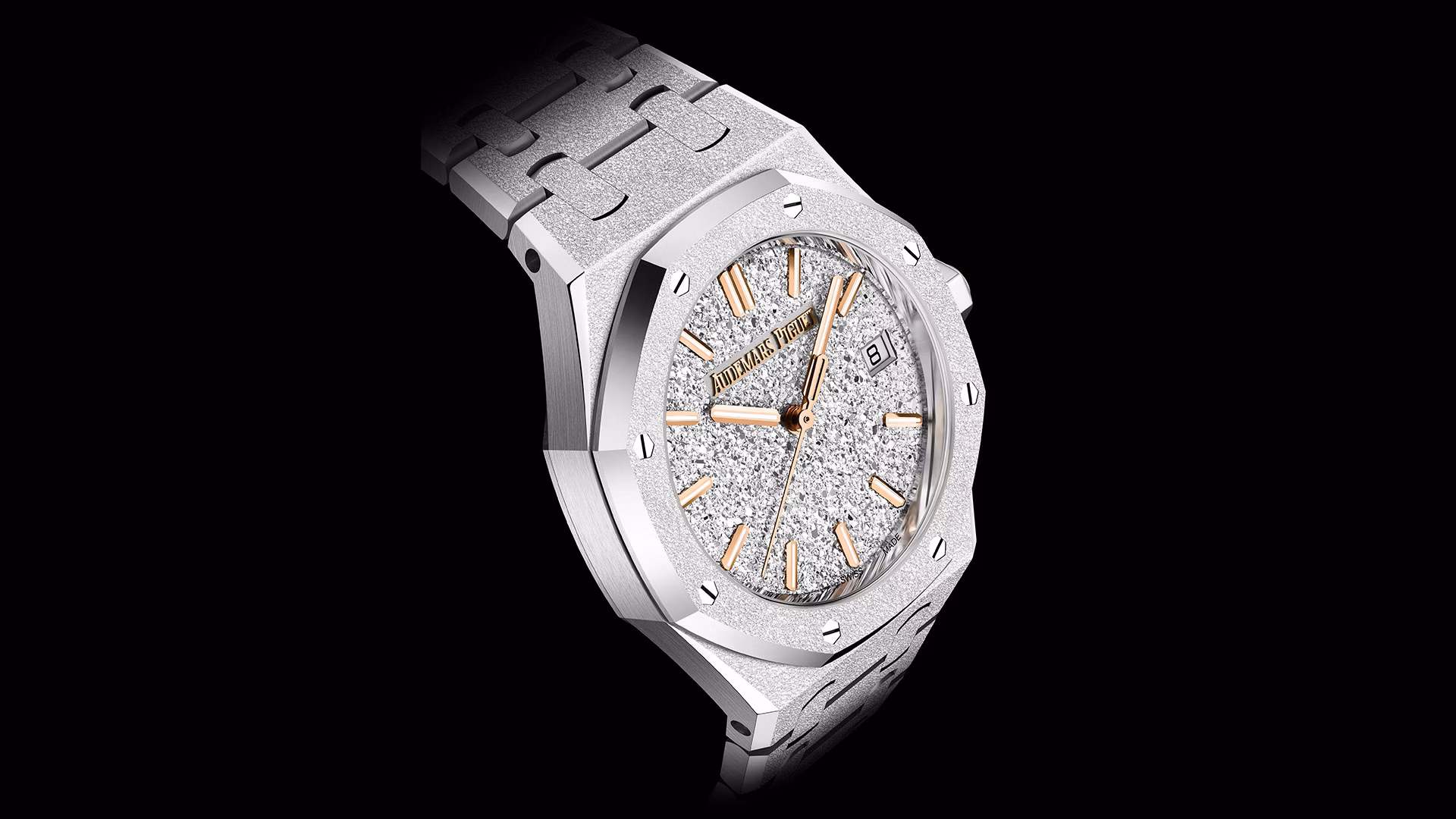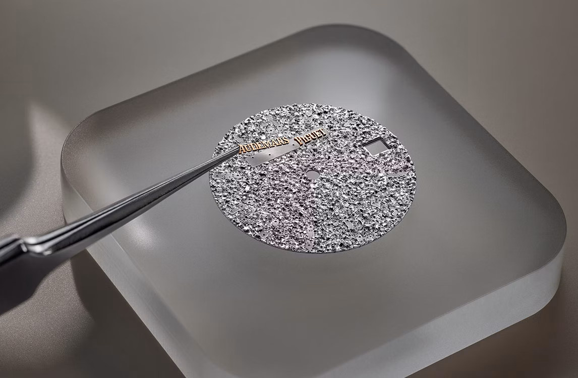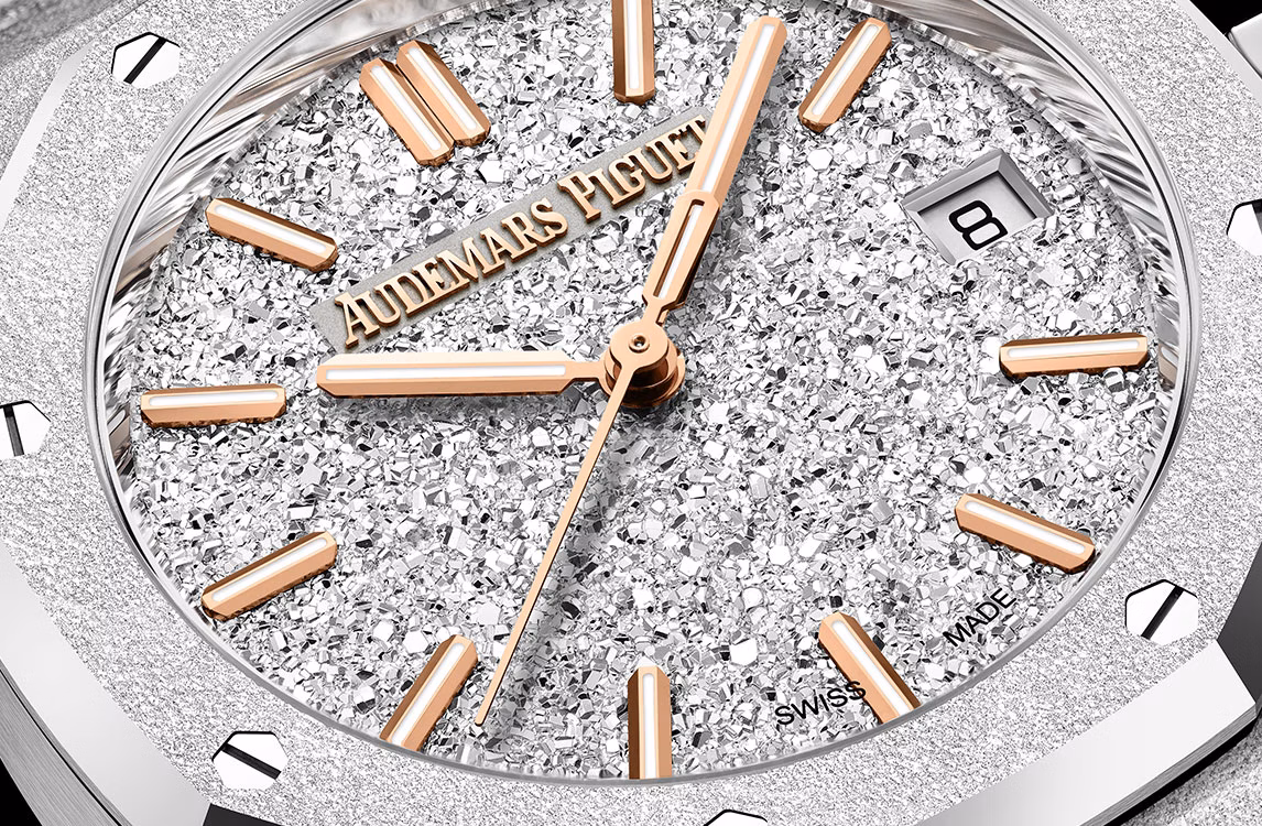 ロジウムプレートのクリスタルサンド仕上げのダイヤル、蓄光処理を施したピンクゴールドのアプライドアワーマーカーとロイヤル オーク針。
