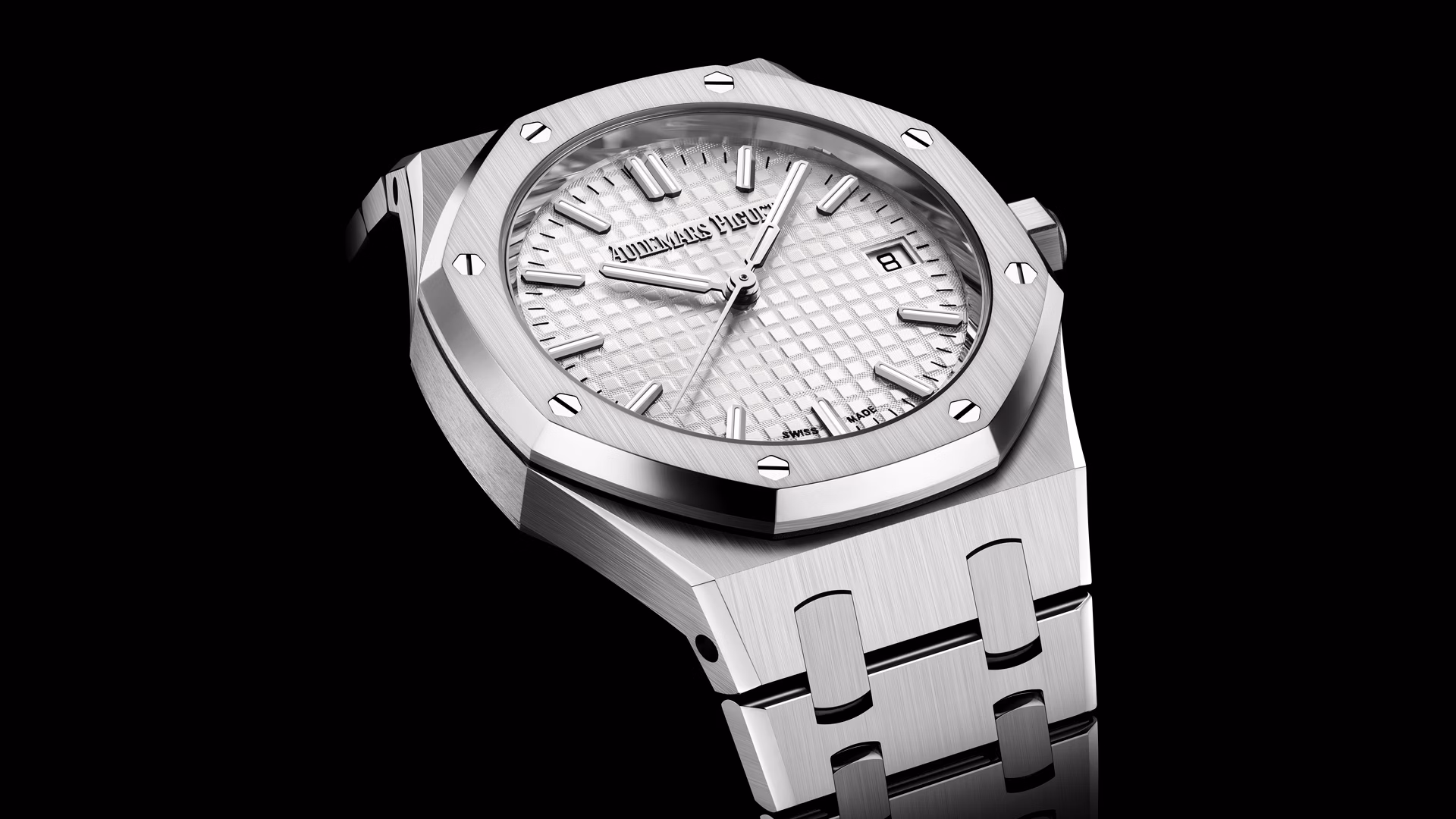 「グランドタペストリー」模様のシルバーカラーダイヤル、蓄光処理を施したホワイトゴールドのアプライドアワーマーカーとロイヤルオーク針。