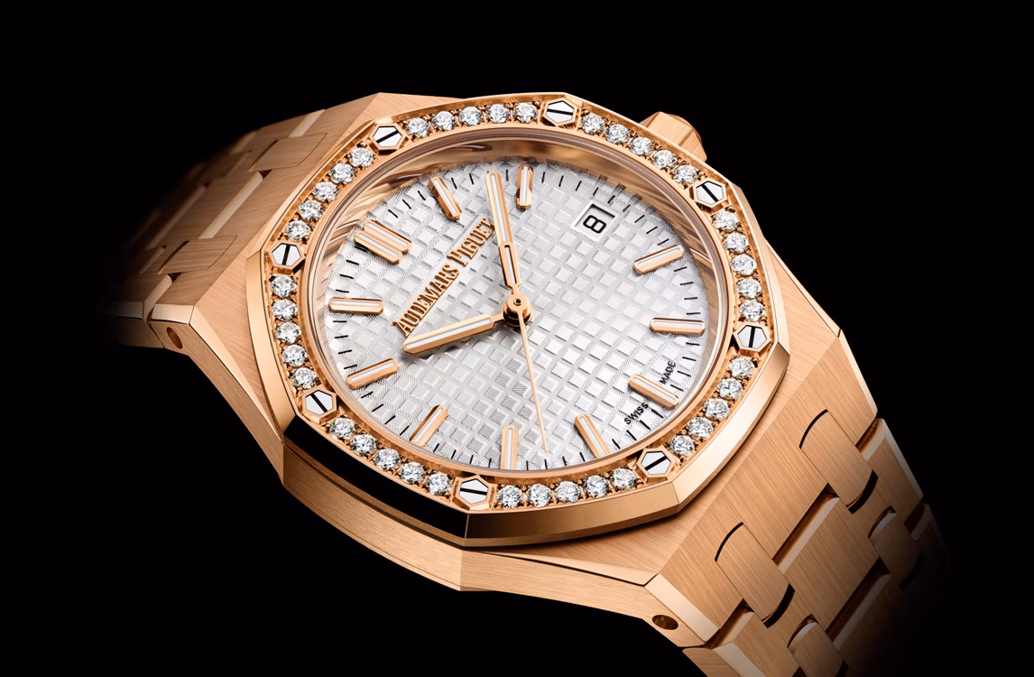 「グランドタペストリー」模様のシルバーカラーダイヤル、蓄光処理を施したピンクゴールドのアプライドアワーマーカーとロイヤルオーク針。