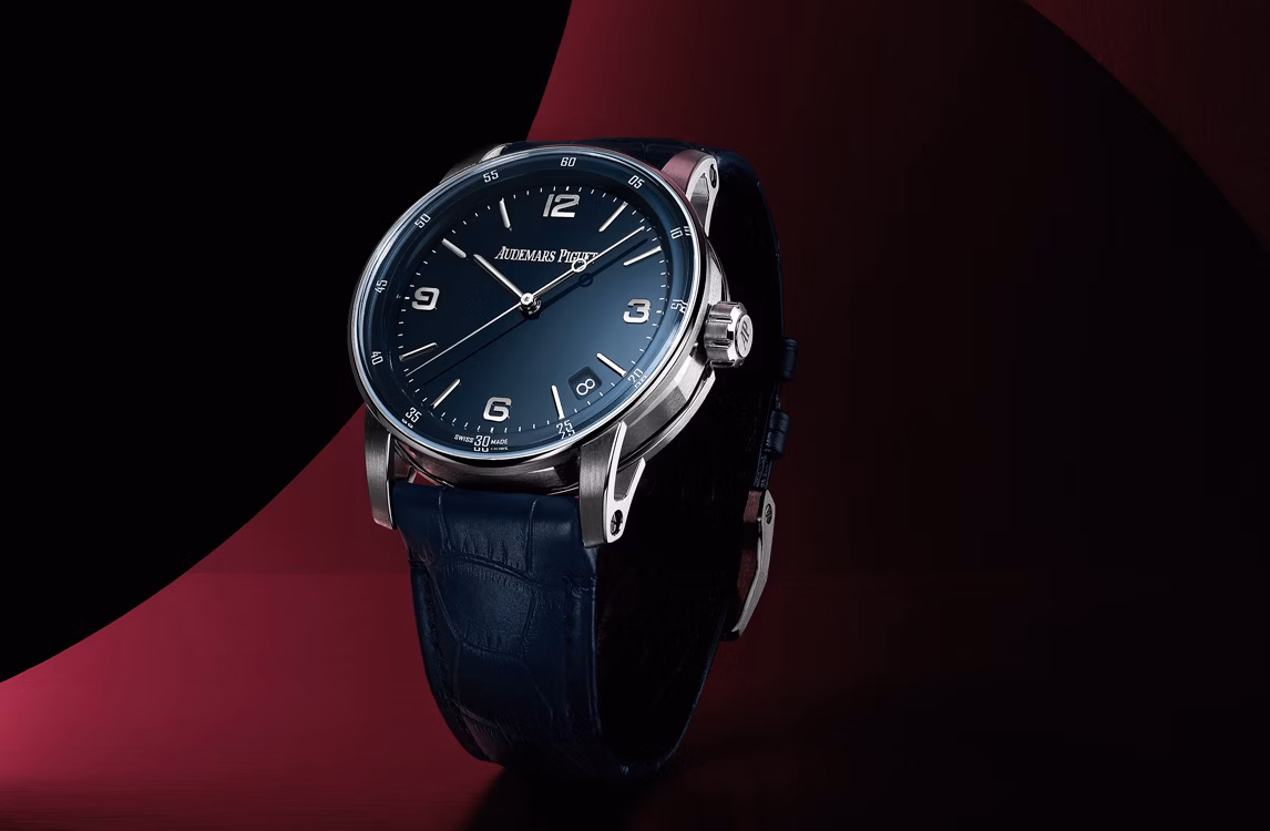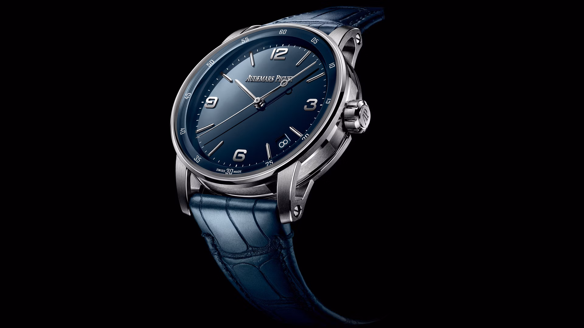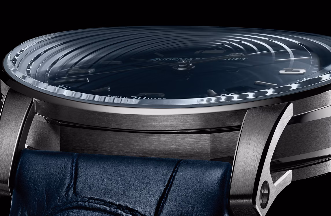 Темно-синее лаковое покрытие циферблата эффектно контрастирует с корпусом из белого золота 750-й пробы, накладной 3D-надписью «Audemars Piguet» из золота, выполненной по технологии гальванического наращивания, и выпуклыми часовыми метками из золота.