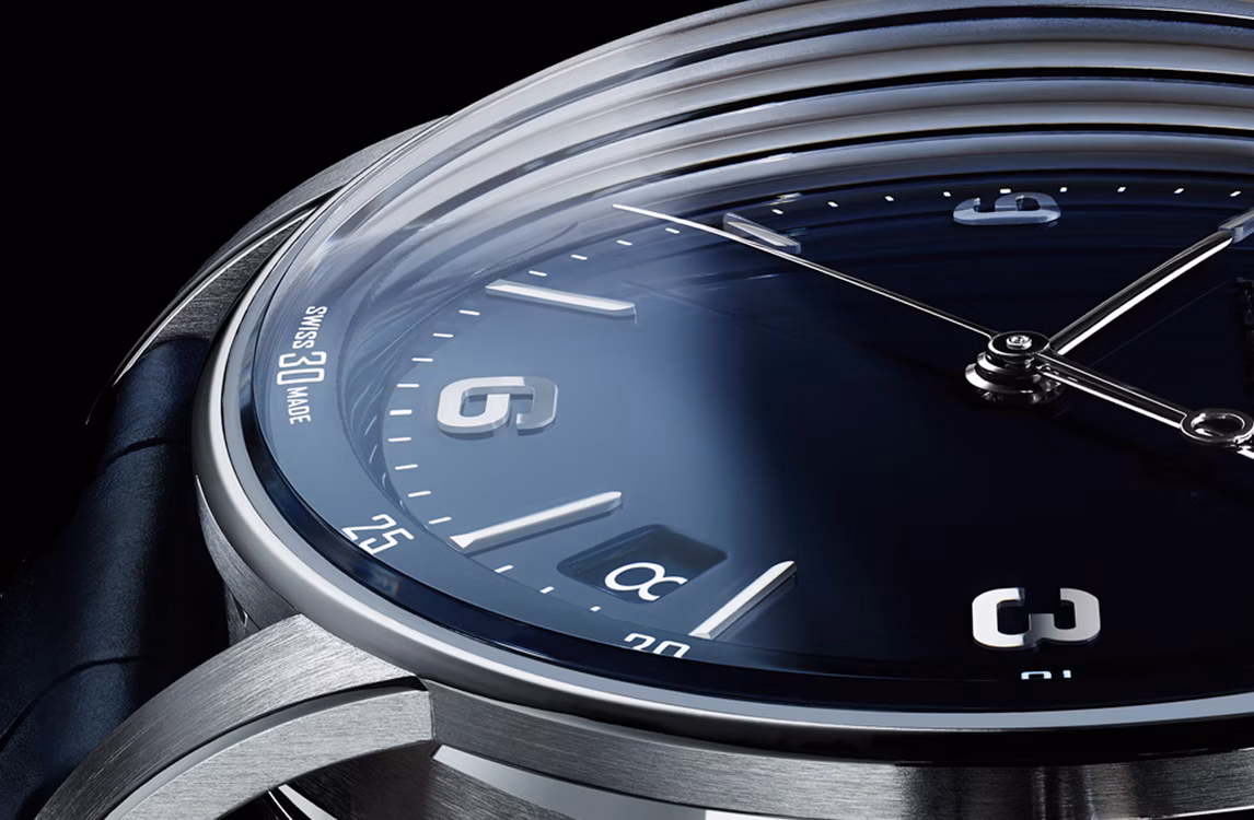 Синий лакированный циферблат, накладные часовые метки и стрелки из белого золота 750-й пробы, логотип из белого золота 999-й пробы, созданный методом гальванического наращивания, синее лакированное внутреннее кольцо.