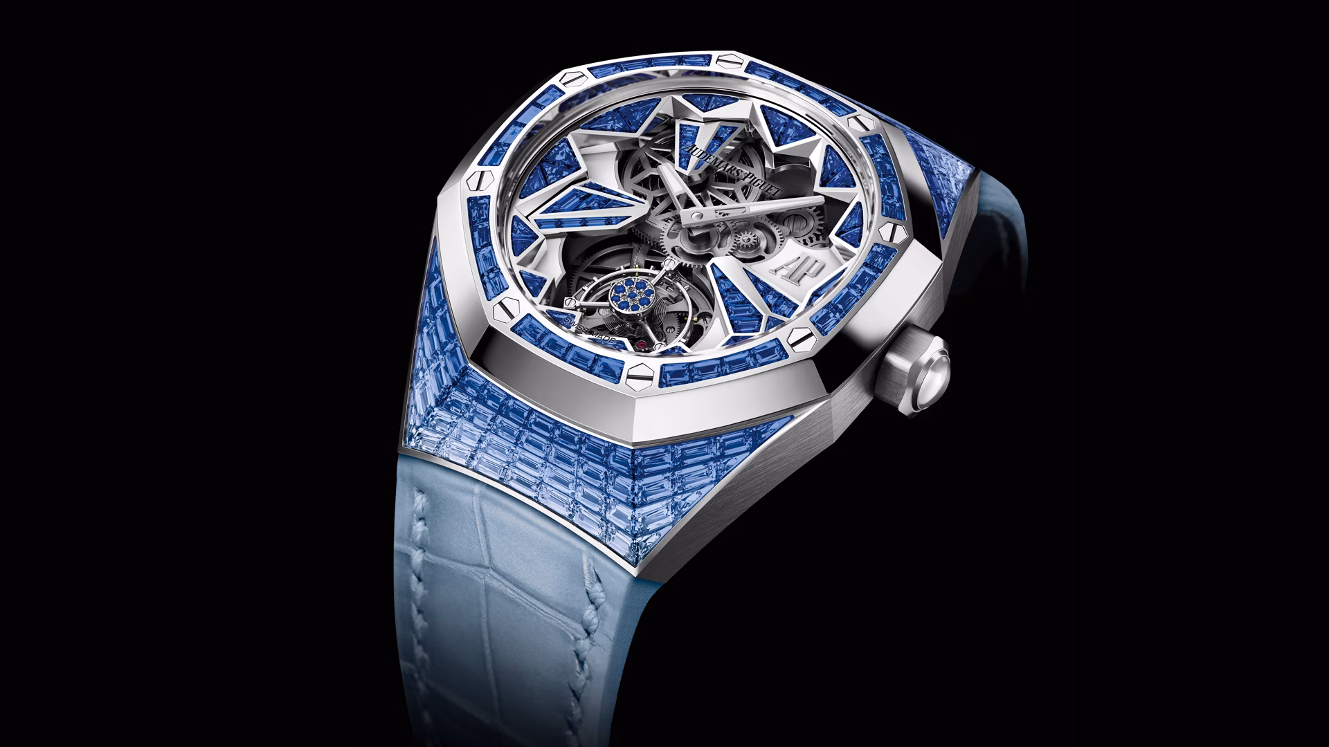 208 сапфиров багетной огранки в различных оттенках синего озаряют корпус, циферблат и отдельные детали механизма в этих часах Royal Oak Concept с Парящим турбийоном, полностью выполненных из белого золота 750-й пробы.