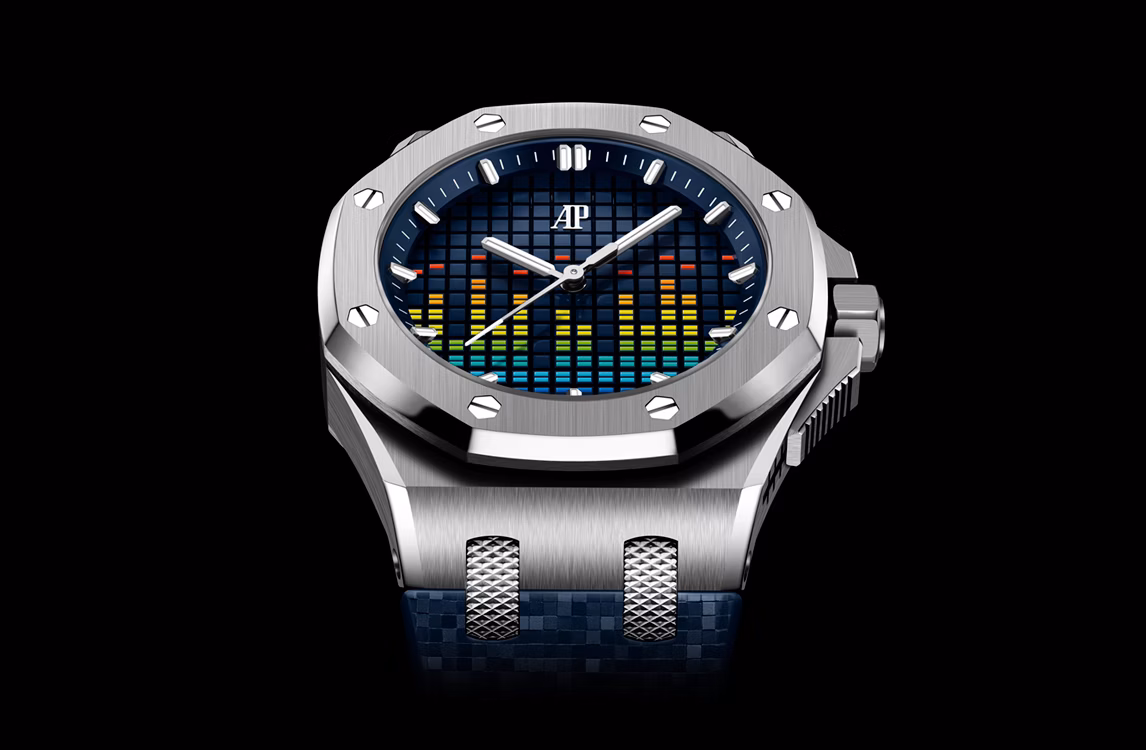 Эстетика этих 37-миллиметровых автоматических часов Royal Oak Offshore из титана, выпущенных лимитированной серией, вдохновлена музыкой: циферблат оформлен в виде шкалы измерителя уровня звука, а накладки заводной головки напоминают ползунки микшера. Общий дизайн часов дополняется сменным ремешком из синего текстурированного каучука — впервые в моделях для изящных запястий.