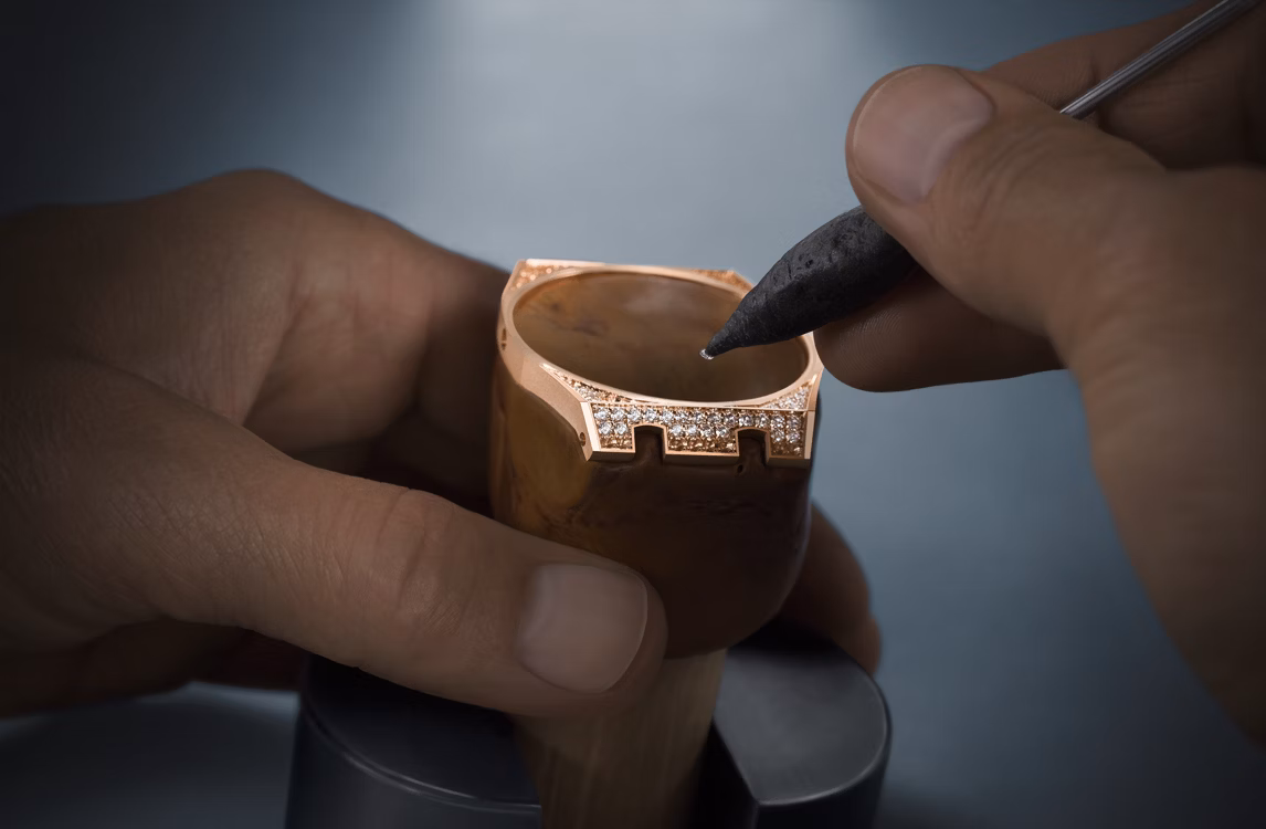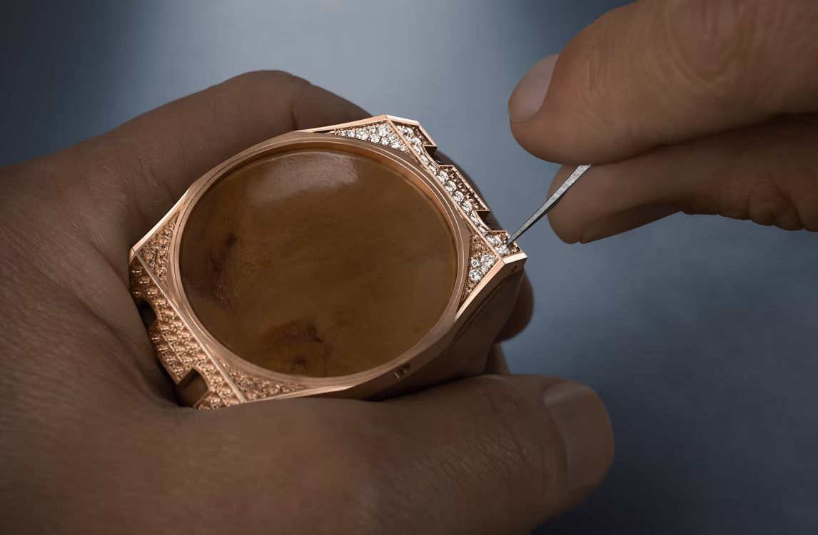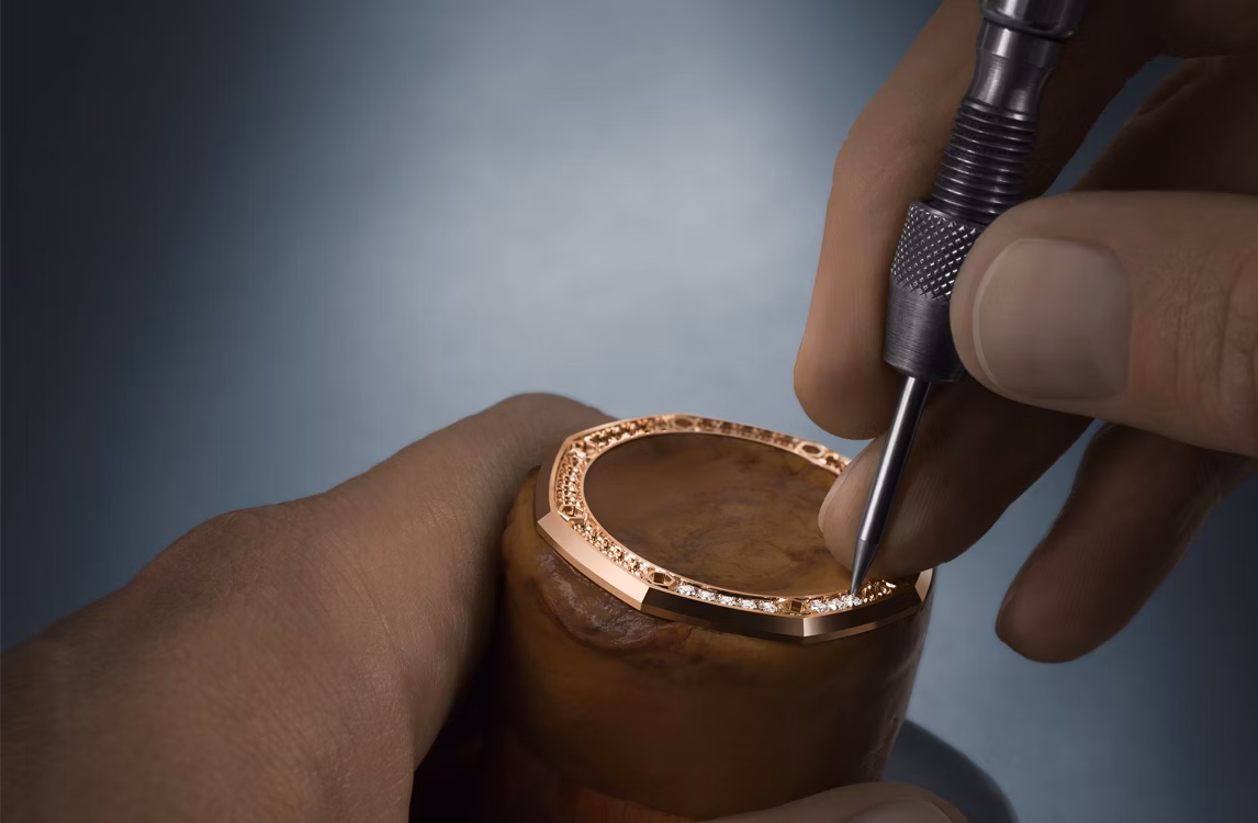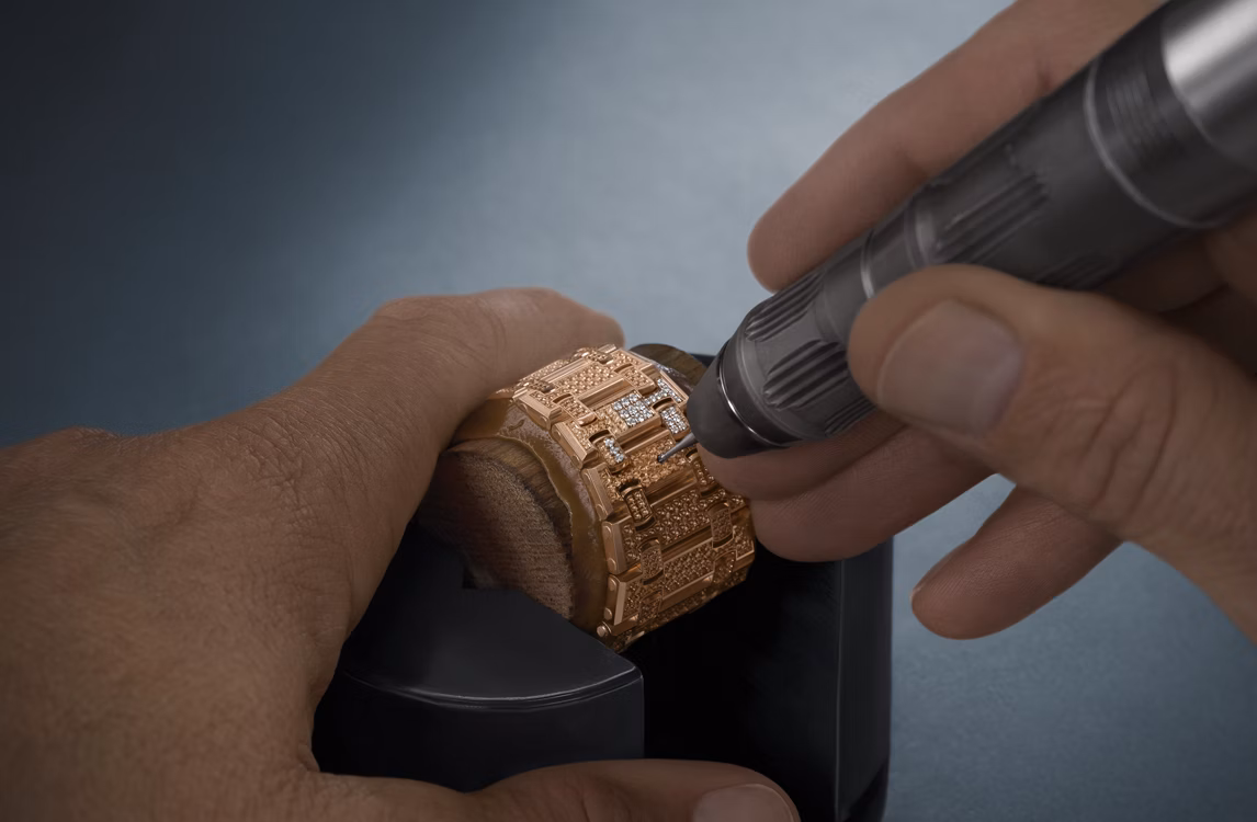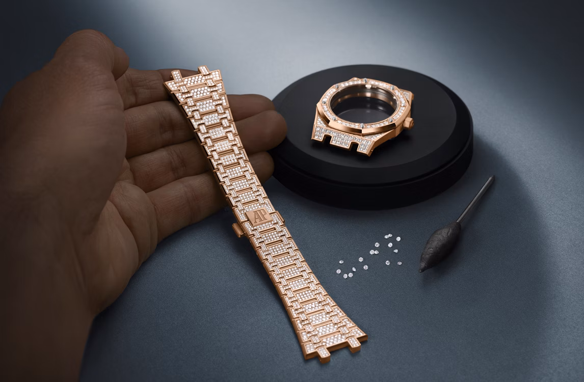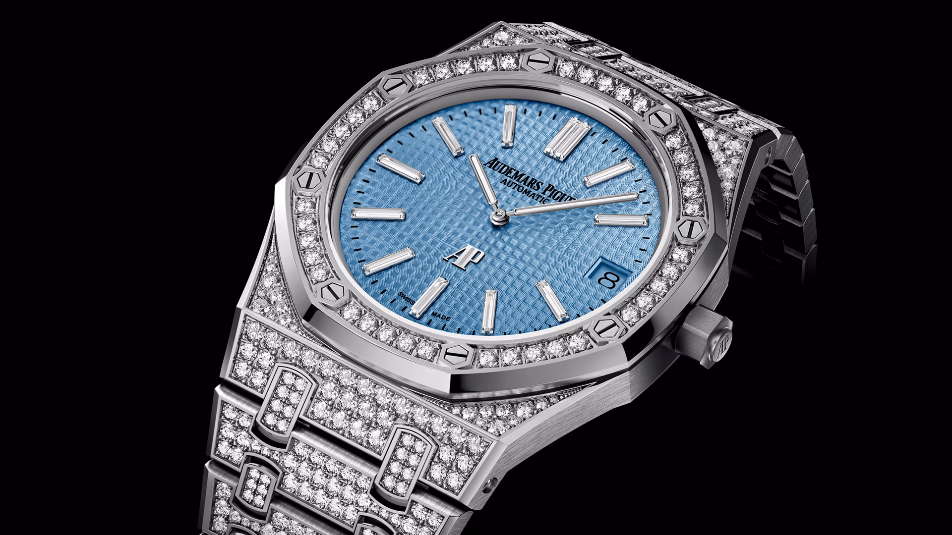 Голубой циферблат с узором «Petite Tapisserie», часовые метки из бриллиантов багетной огранки и стрелки Royal Oak из белого золота с осажденным люминесцентным покрытием