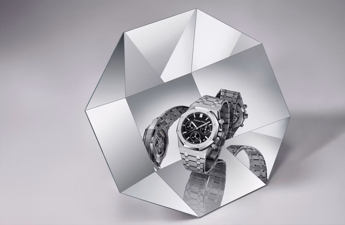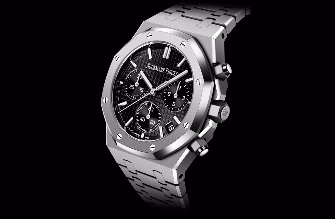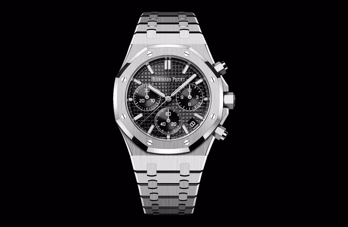 В этом 41-миллиметровом хронографе обыгрывается контраст между нержавеющей сталью и черным циферблатом с узором «Grande Tapisserie». Часы, воплотившие в себе очередное обновление дизайна коллекции Royal Oak, оснащены ротором с логотипом «50-years», которым можно любоваться сквозь сапфировое стекло в задней крышке.