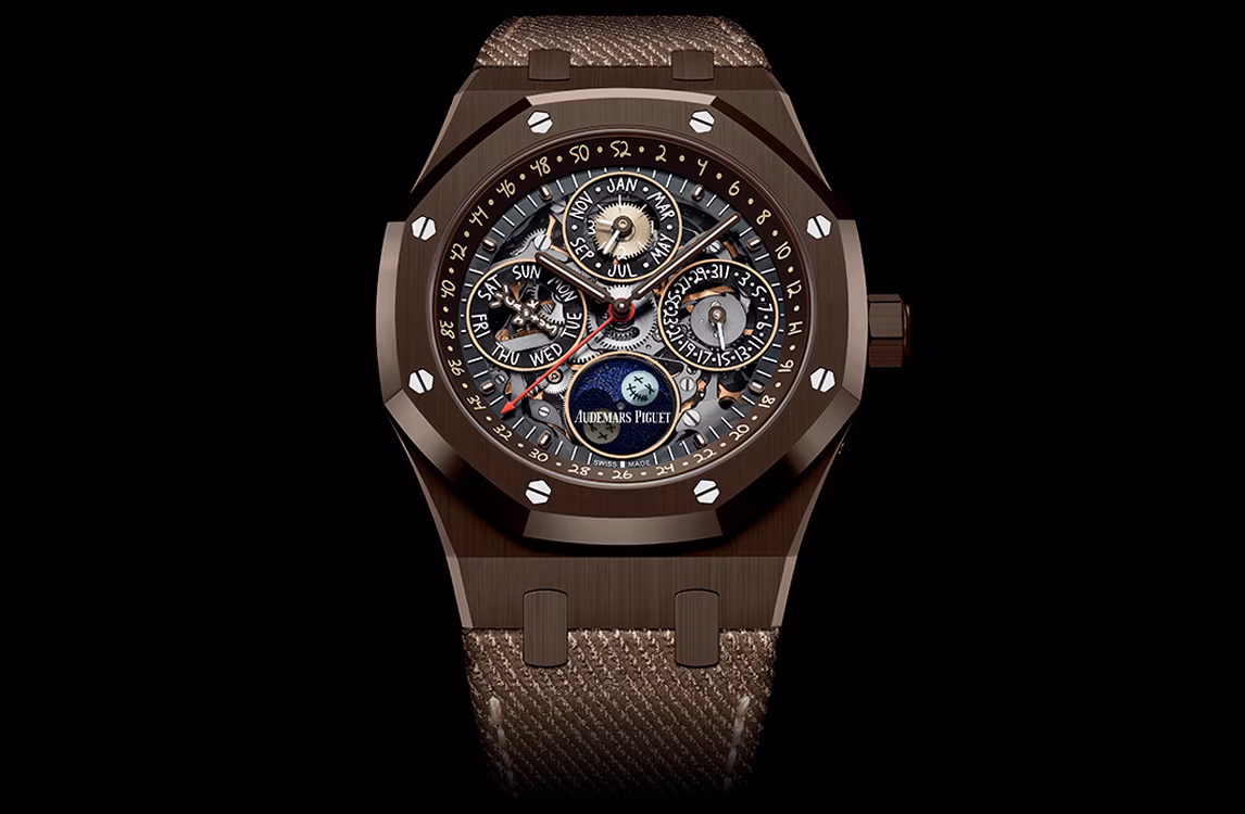 Циферблат из сапфирового стекла, дымчатая внешняя зона счетчиков, коричневые накладные метки и стрелки Royal Oak с осажденным люминесцентным покрытием, коричневое внутреннее кольцо.
