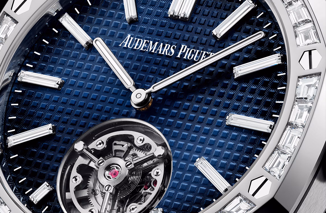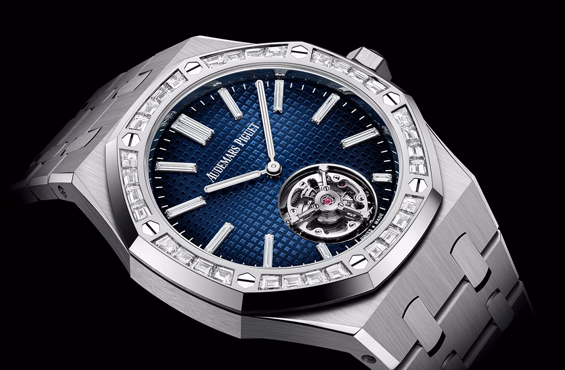 Дымчато-синий циферблат с узором «Petite Tapisserie», часовые метки с бриллиантами багетной огранки, стрелки Royal Oak из белого золота с осажденным люминесцентным покрытием.