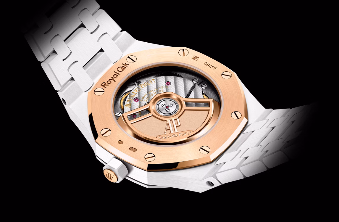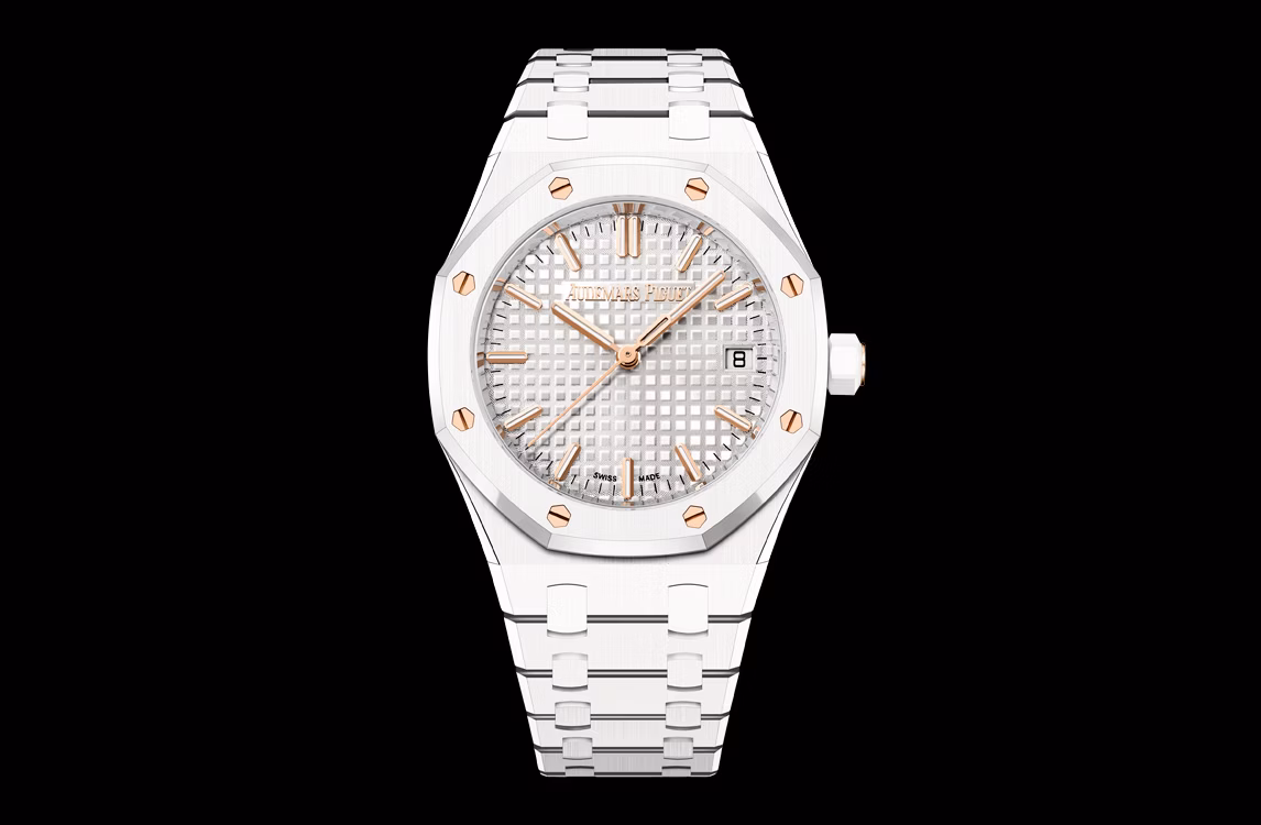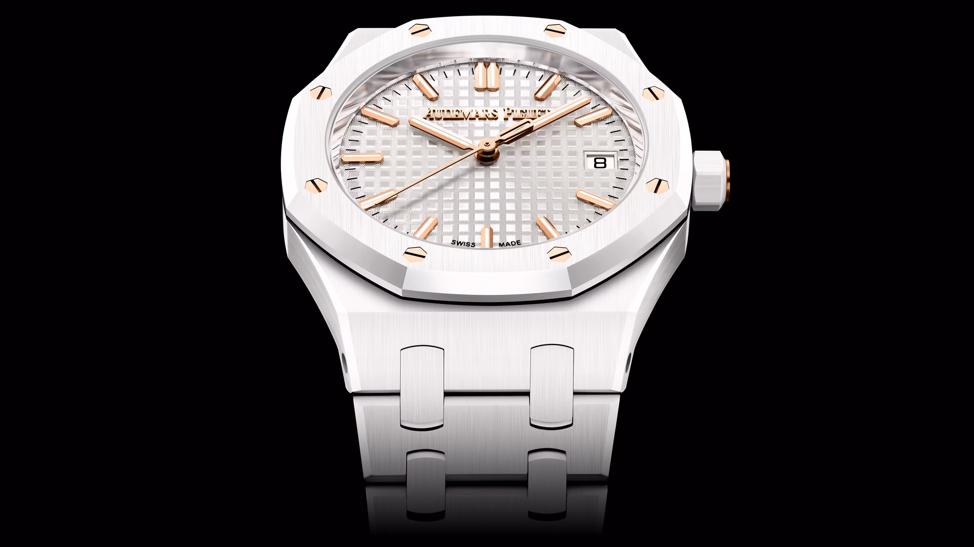 Использование белой керамики в этих 34-миллиметровых часах Royal Oak в сочетании с серебристым циферблатом «Grande Tapisserie» и акцентами из розового золота привносит элегантную роскошь в облик этих культовых часов.