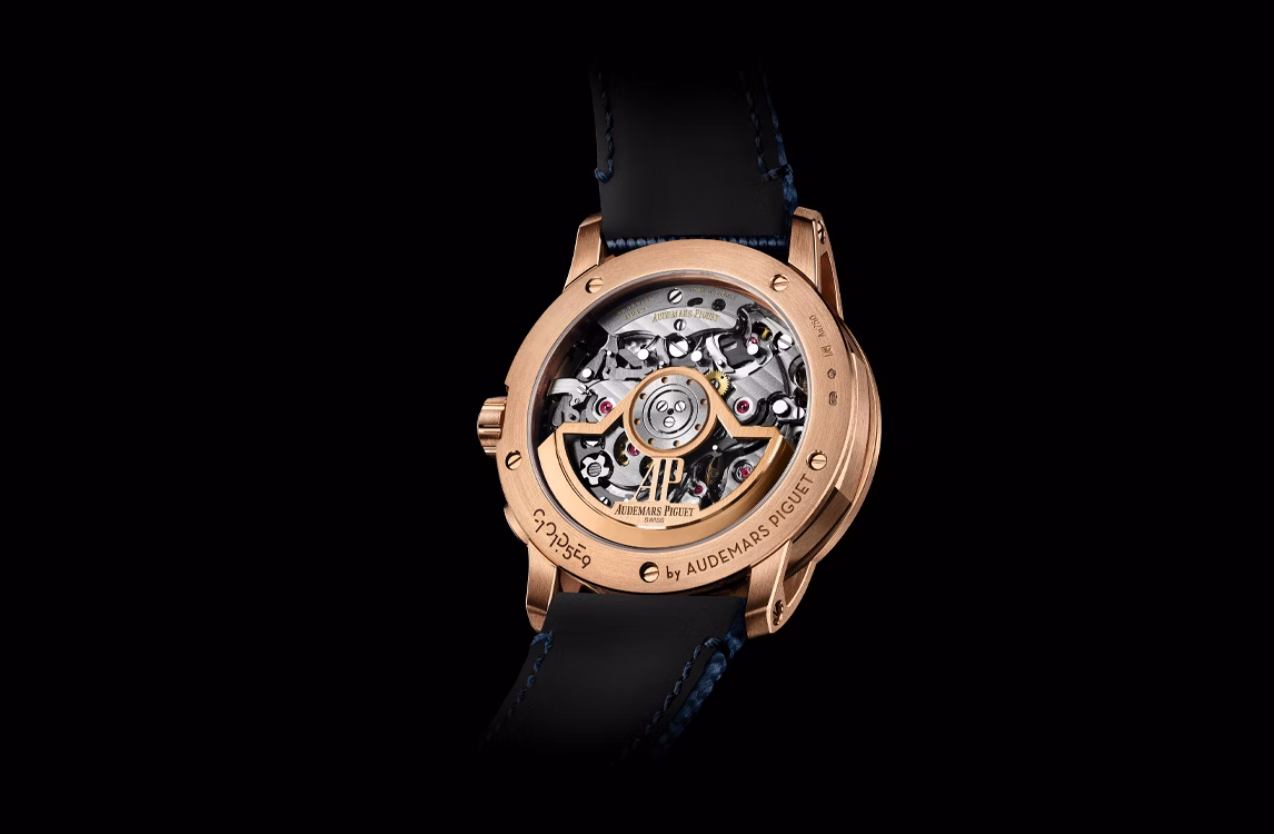 18K玫瑰金表壳,搭配防眩光处理蓝宝石水晶玻璃表镜和表底。