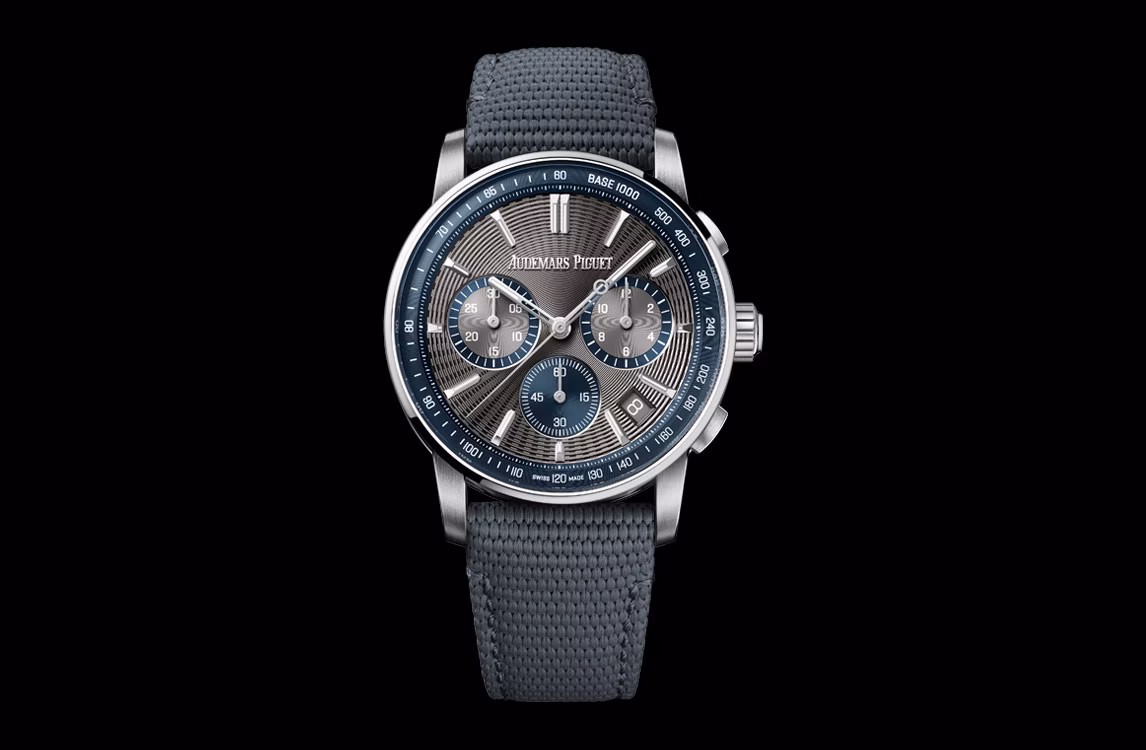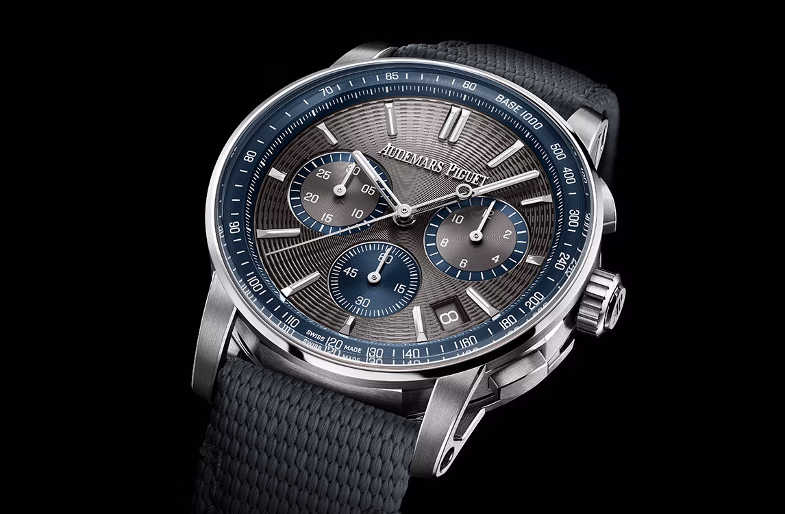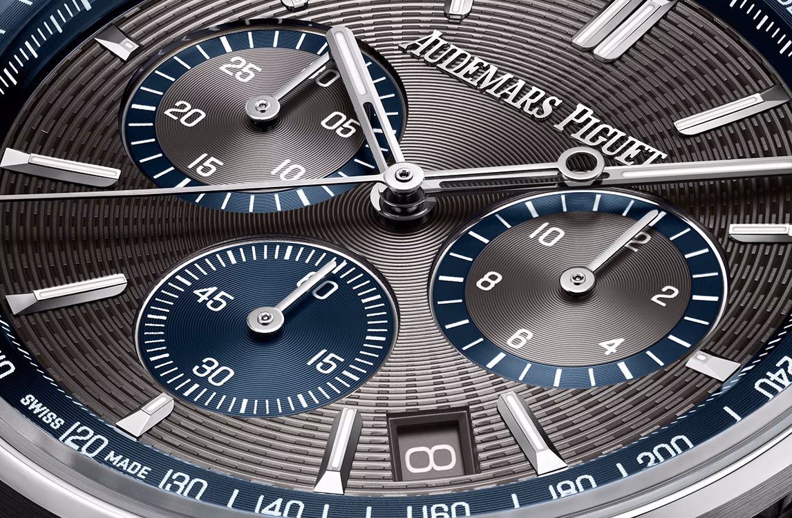 灰色浮雕纹饰表盘,搭配18K白金荧光时标与指针,内表圈和副表盘外区则以蓝色呈现。