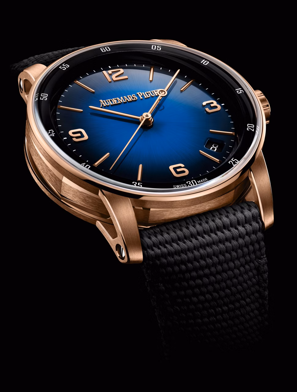煙燻藍色亮漆錶面鐫刻太陽紋裝飾圖案,搭配18K玫瑰金立體時標與指針、黑色亮漆內錶圈。