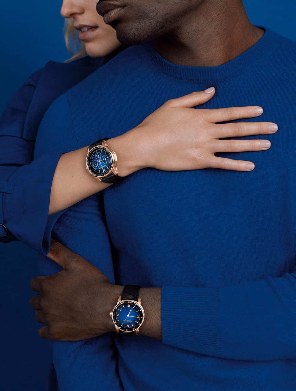藍色包覆橡膠錶帶搭配18K玫瑰金針式帶扣。