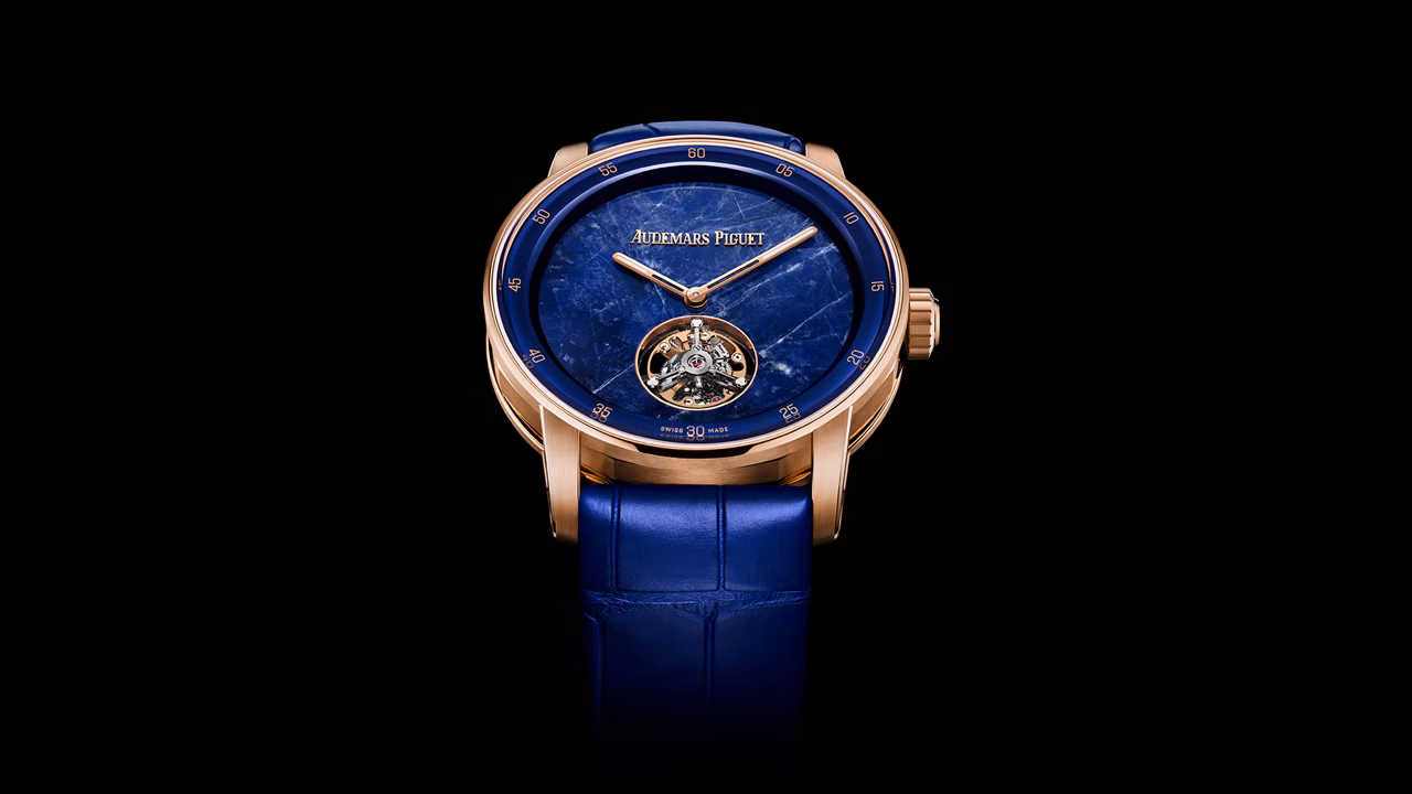 藍色方鈉石錶盤上點綴著同色調內錶圈,以及內填螢光材質的18K玫瑰金指針。
