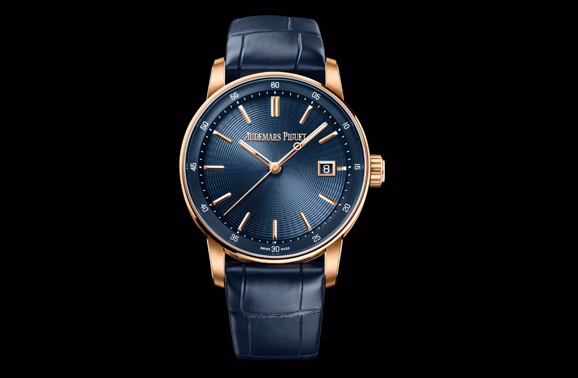「雲夜藍50」色調錶面,搭配螢光塗層玫瑰金立體時標與指針、藍色內錶圈。