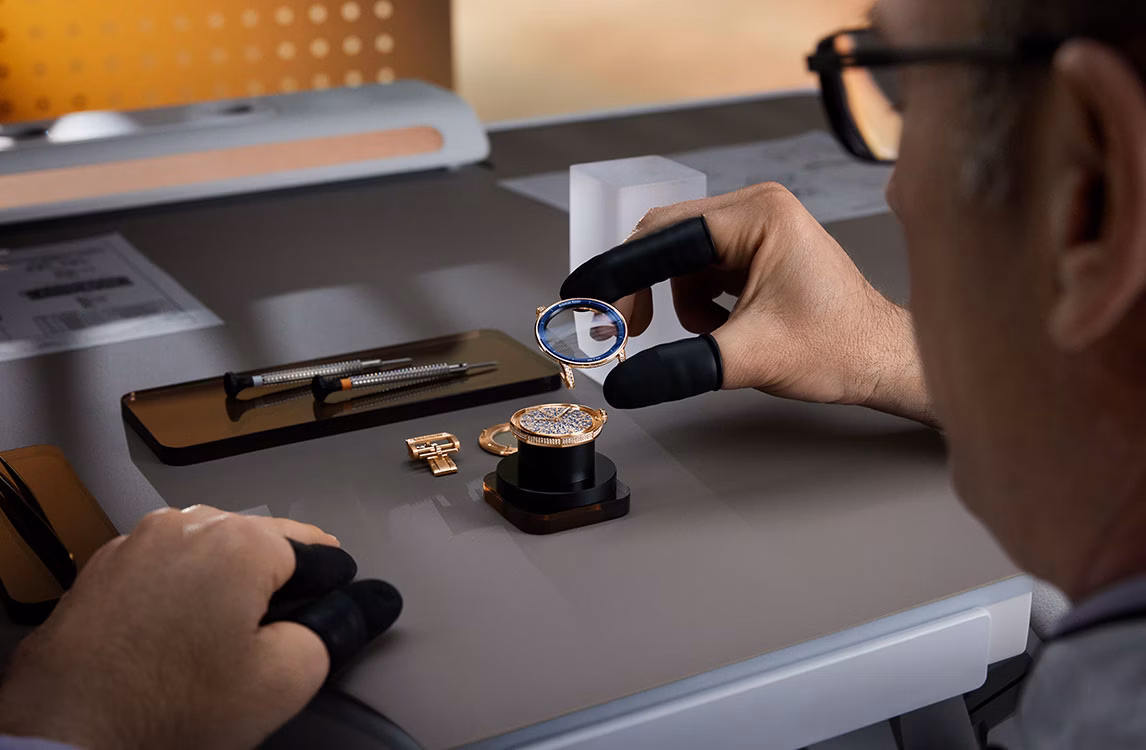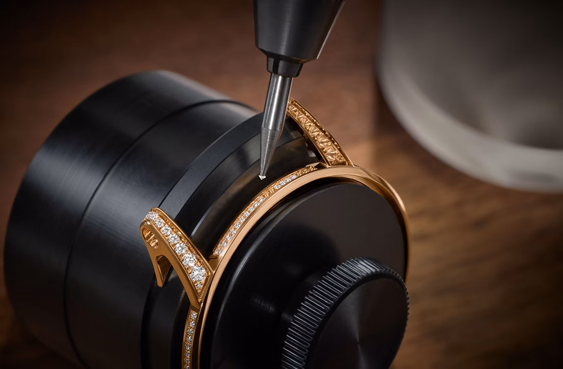 18K玫瑰金錶殼鑲嵌明亮式切割美鑽,搭配雙面防炫光處理藍寶石水晶玻璃鏡面和底蓋。