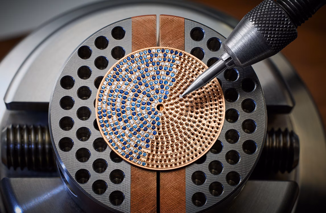 全錶鑲嵌910顆明亮式切割美鑽;總重約3.53克拉。335顆明亮式切割美鑽;總重約1.42克拉(錶殼)。533顆明亮式切割美鑽與藍寶石;總重約1.95克拉(錶面)。42顆明亮式切割美鑽;總重約0.16克拉(錶扣)。