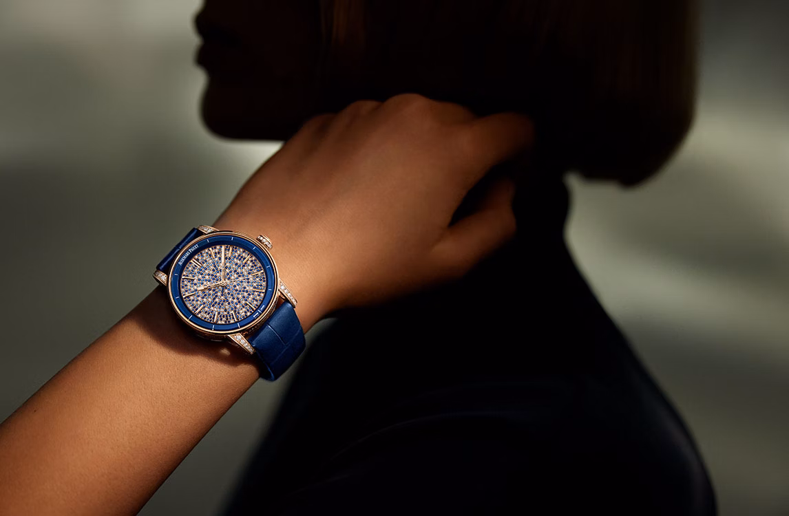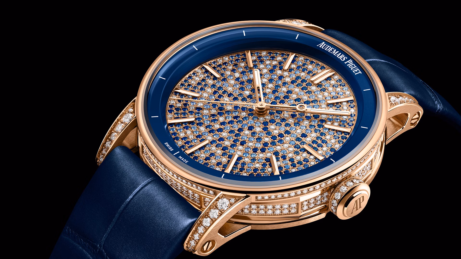 錶面鑲嵌明亮式切割藍色調藍寶石與美鑽,搭配玫瑰金立體時標、螢光塗層玫瑰金指針、藍色調內錶圈。