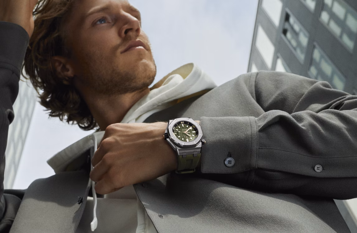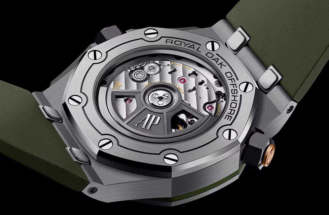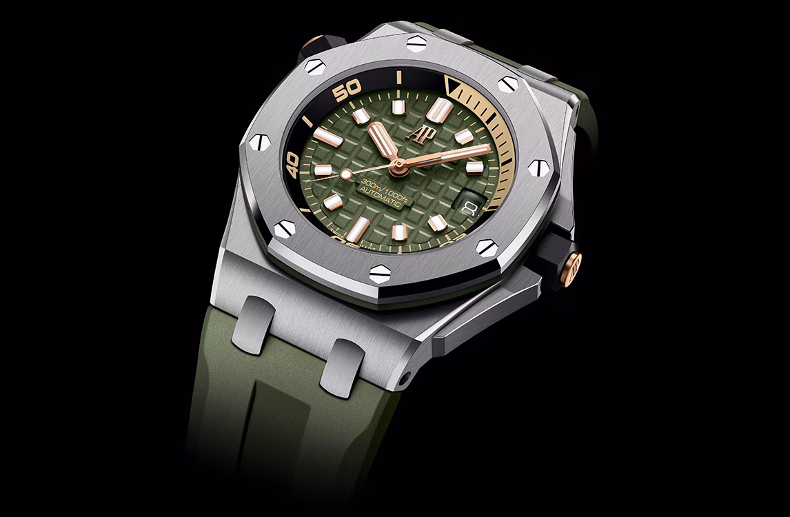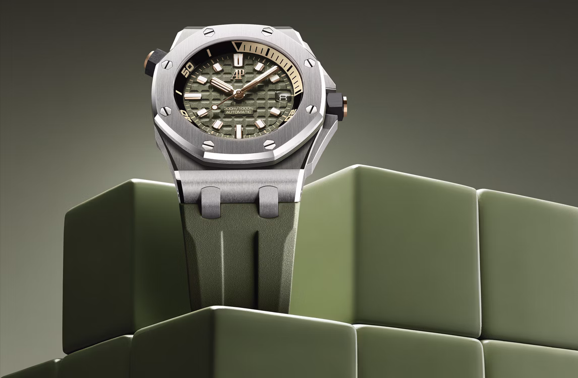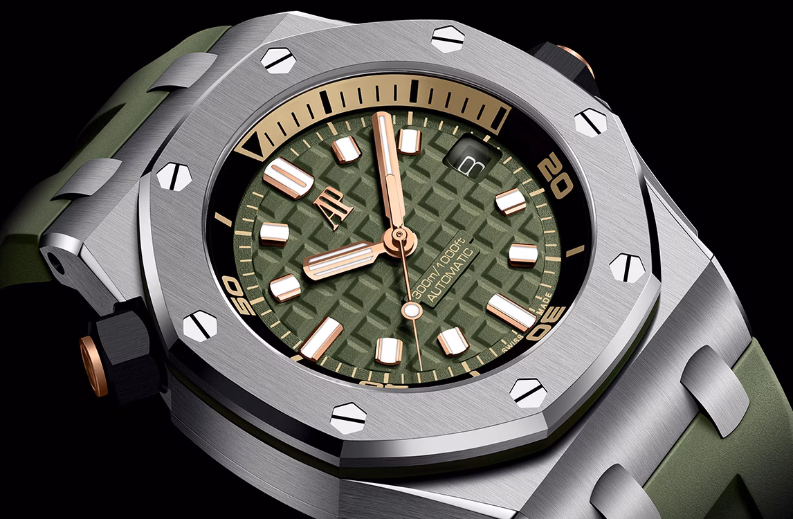 軍綠色錶面鐫刻「Méga Tapisserie」超大型格紋裝飾圖案,搭配螢光塗層玫瑰金立體時標與皇家橡樹指針、黑色潛水計時旋轉內錶圈及米色60至15分鐘區域
