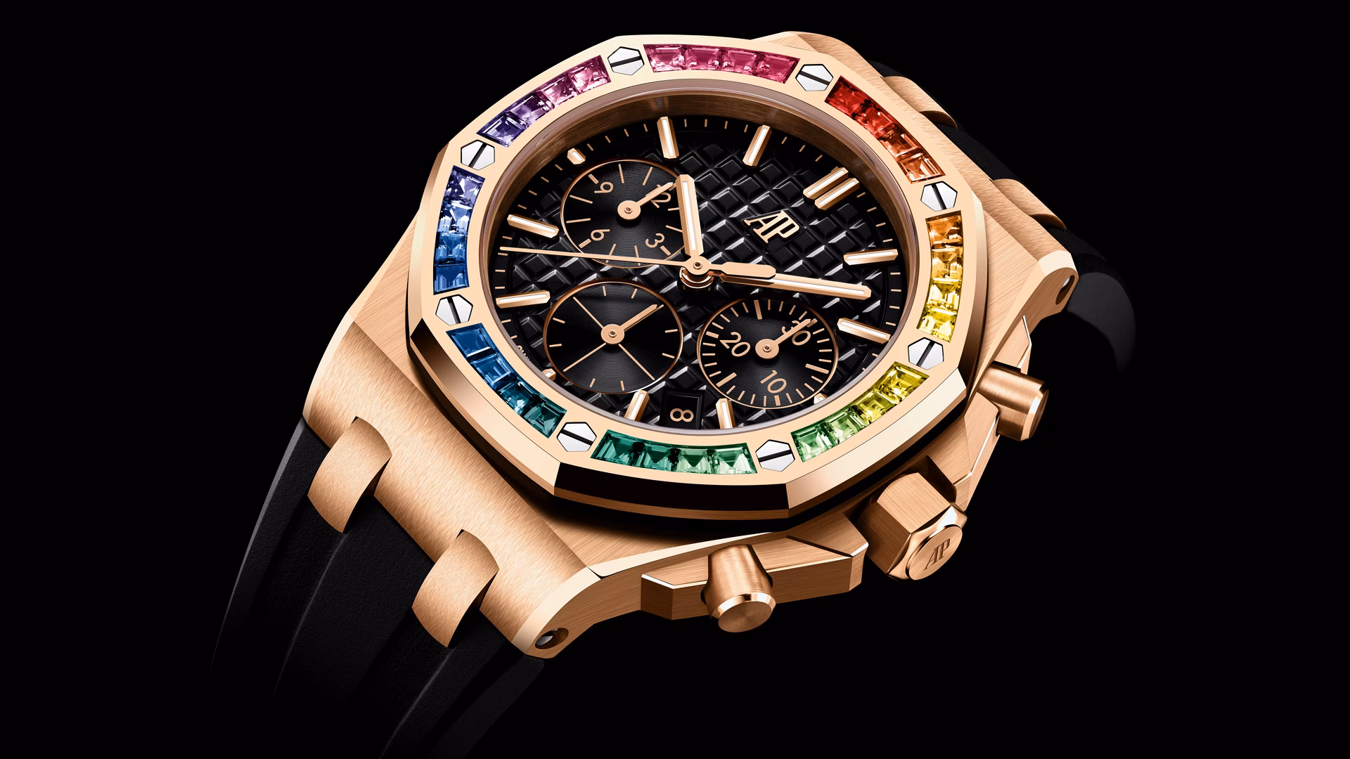 18K玫瑰金錶殼,錶圈鑲嵌長方形切割彩虹色寶石,搭配經防炫光處理藍寶石水晶玻璃鏡面、旋入式錶冠。