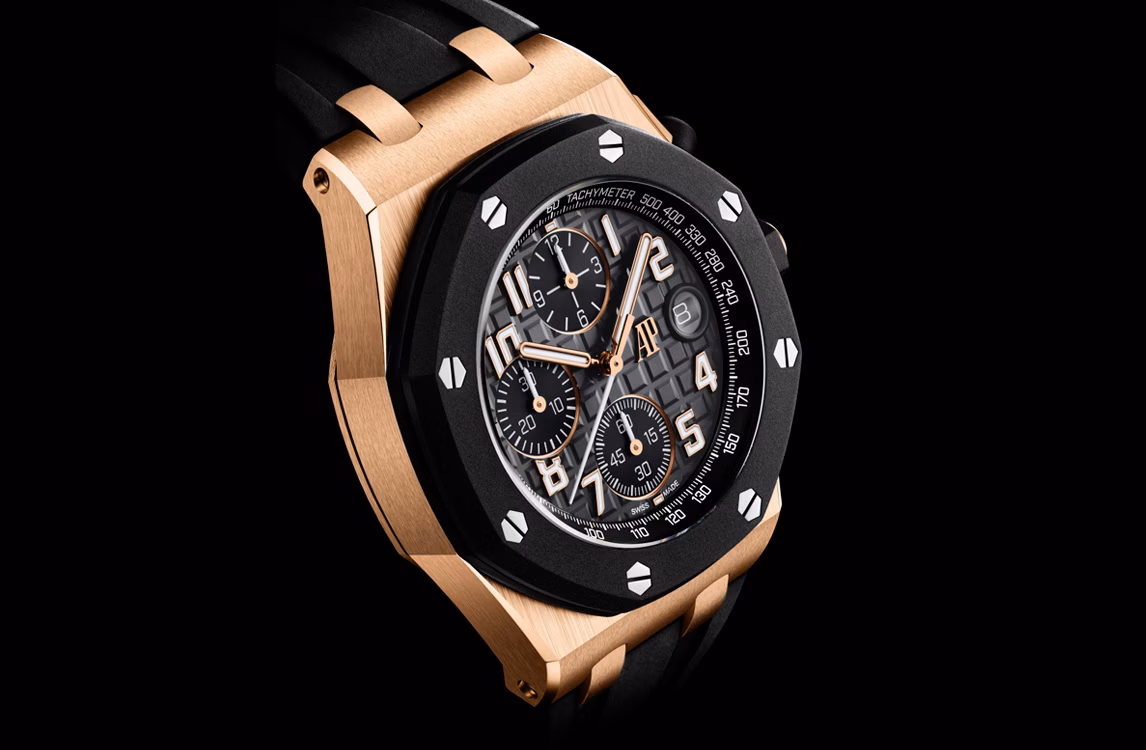 深灰色錶面鐫刻「Méga Tapisserie」超大型格紋裝飾圖案,搭配黑色計時器與內錶圈、螢光塗層阿拉伯數字時標與玫瑰金皇家橡樹指針。