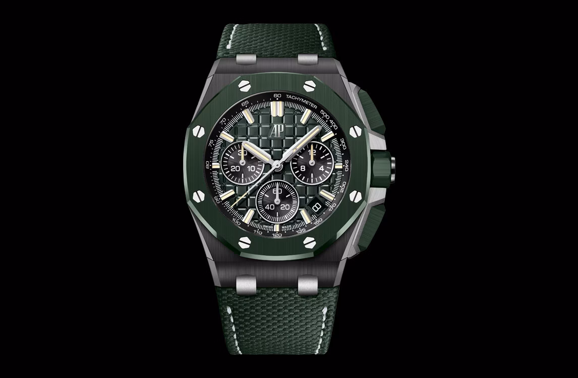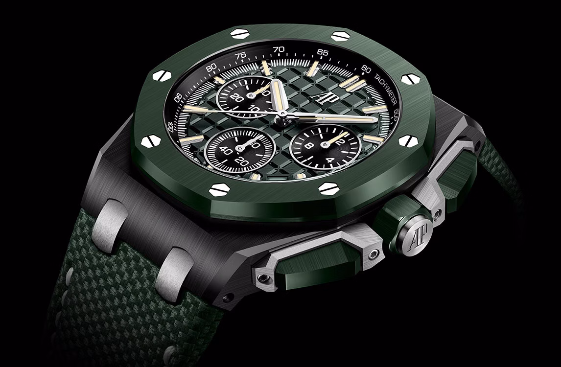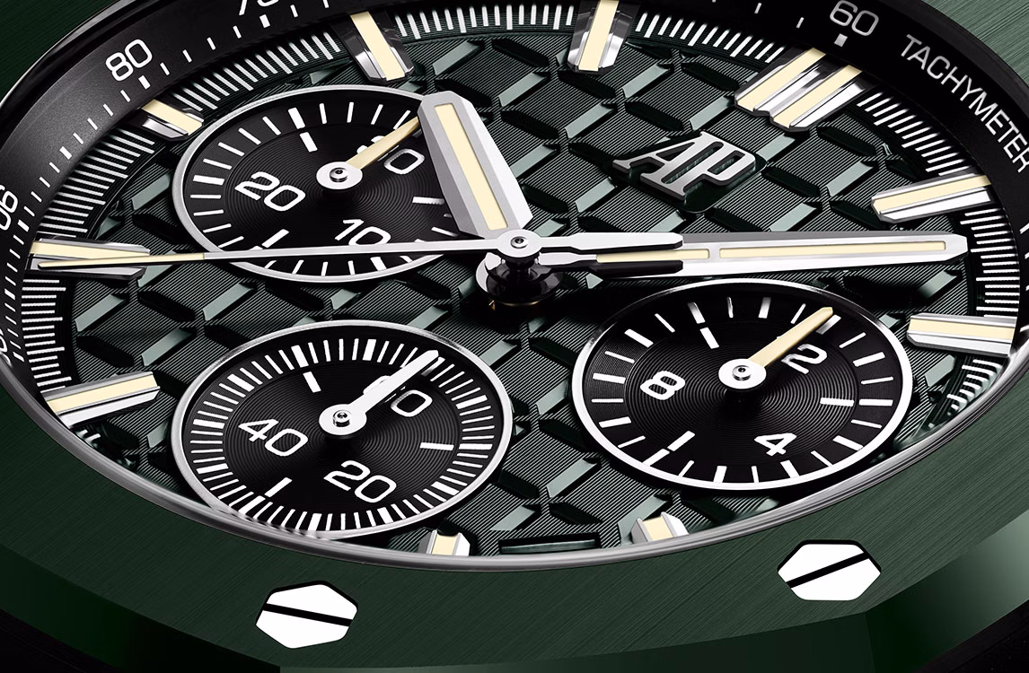 深綠色「Mega Tapisserie」超大型格紋裝飾錶盤,與黑色計時器及內錶圈形成對比,18K白金時標及指針內填螢光材質。