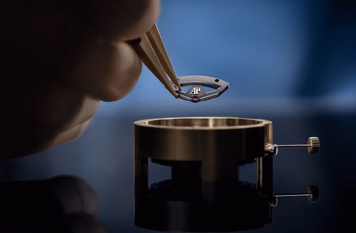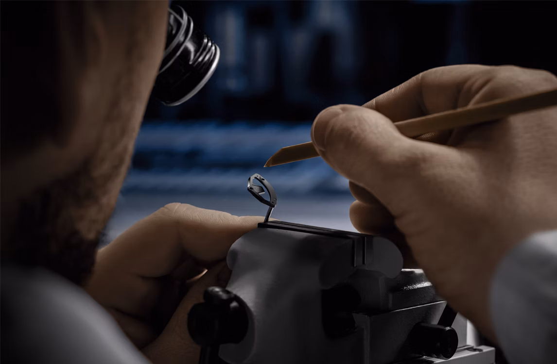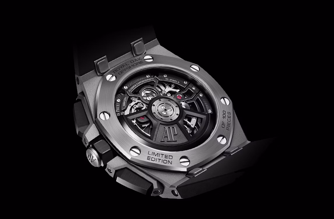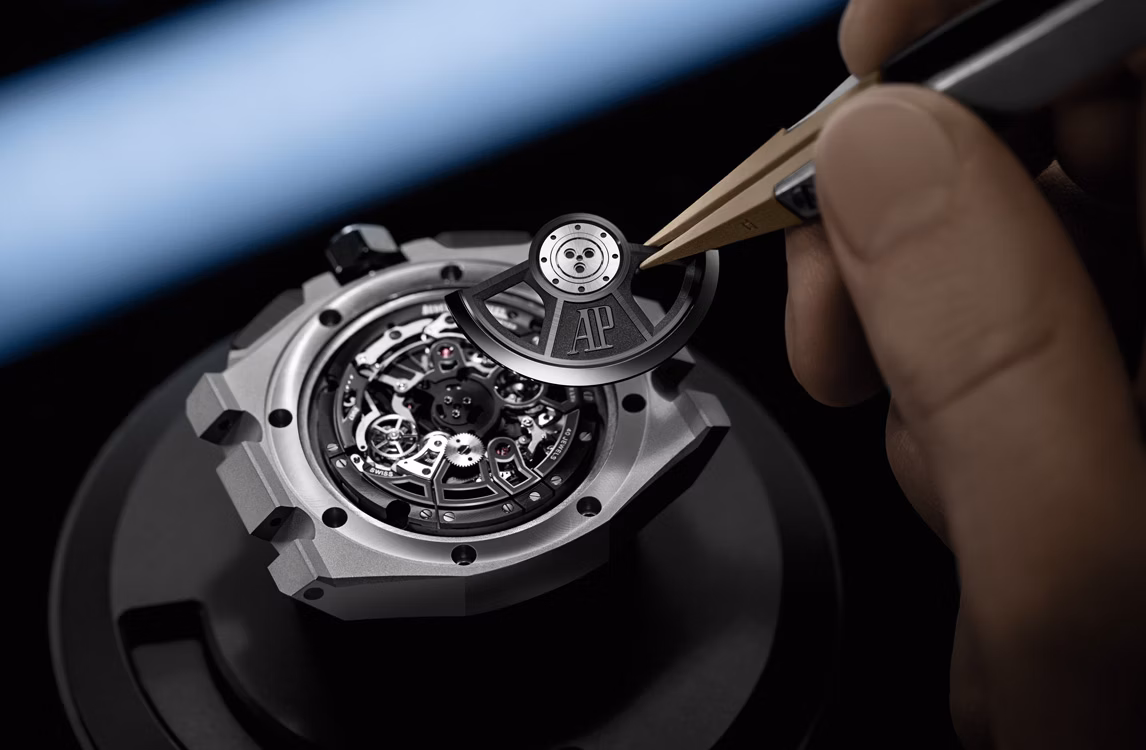 黑色內錶圈,搭配鏤空錶面、18K白金指針
