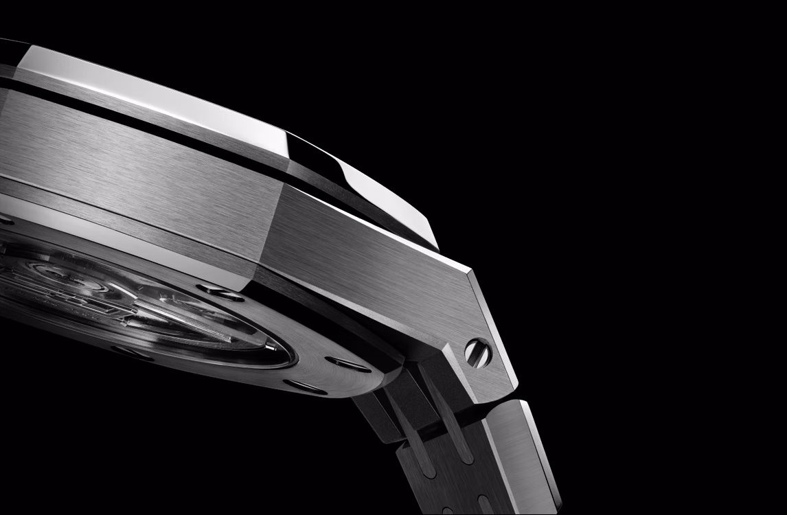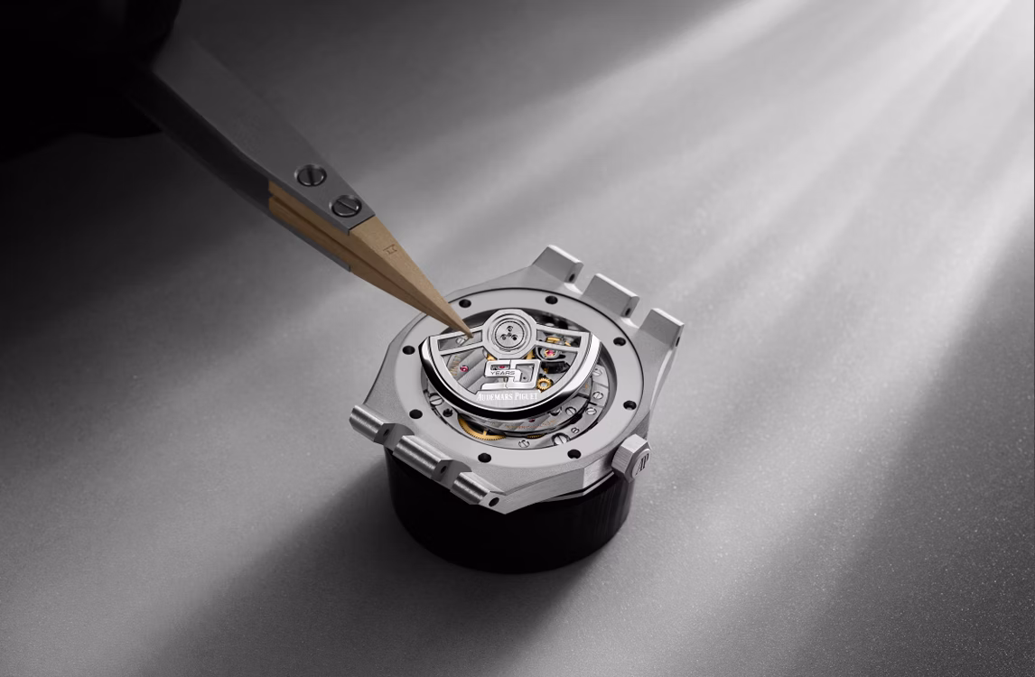 淺藍色錶面鐫刻「Grande Tapisserie」大型格紋裝飾圖案,搭配螢光塗層白金立體時標與皇家橡樹指針。
