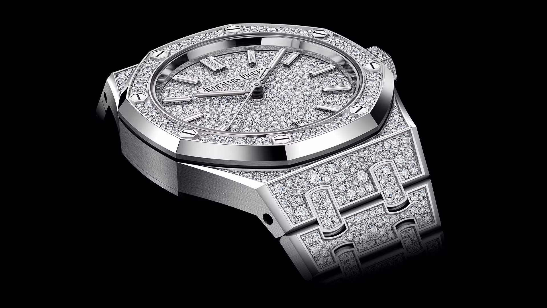 18K白金錶面,雪花鑲嵌明亮式切割美鑽,搭配長方形切割美鑽時標、螢光塗層白金Royal Oak皇家橡樹指針。
